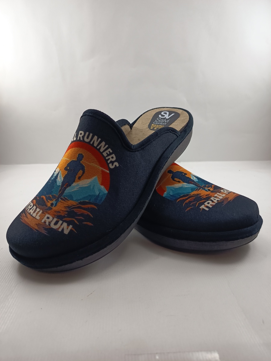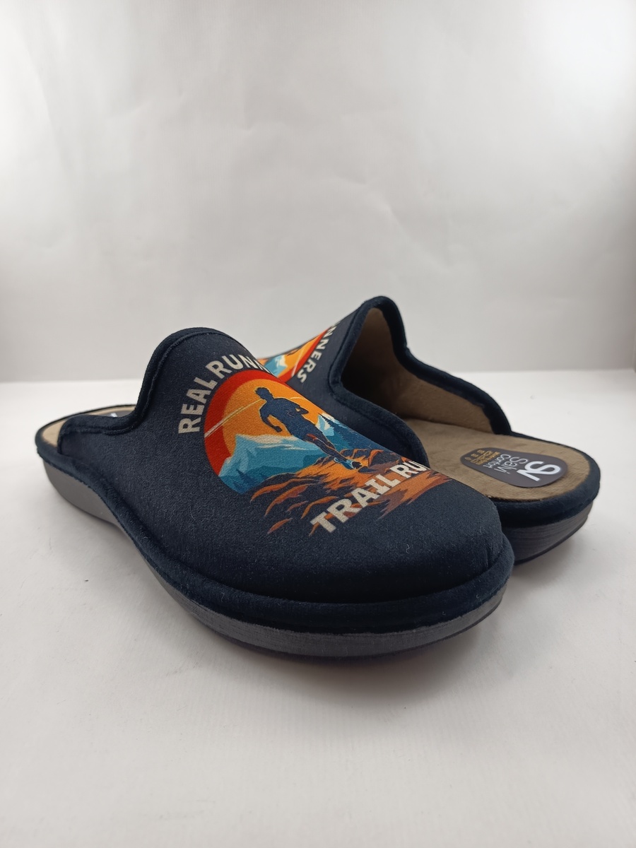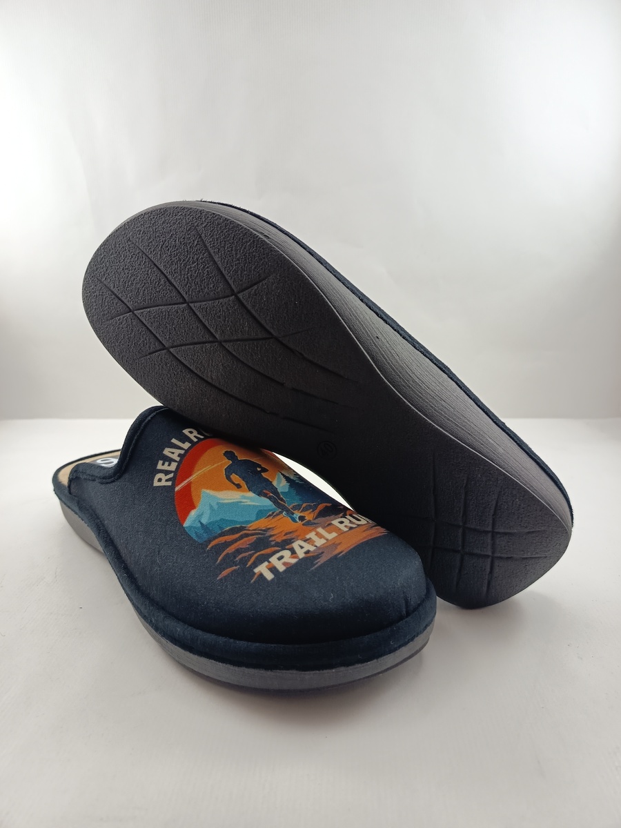 Alpargata de casa tipo chancla sintetica negra sin cierres y suela de goma, forro y plantilla textil, detalle de dibujo en empeine.