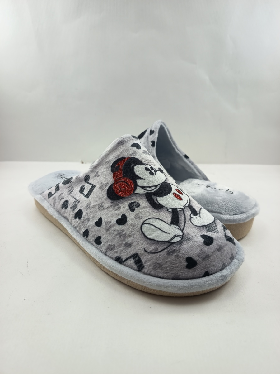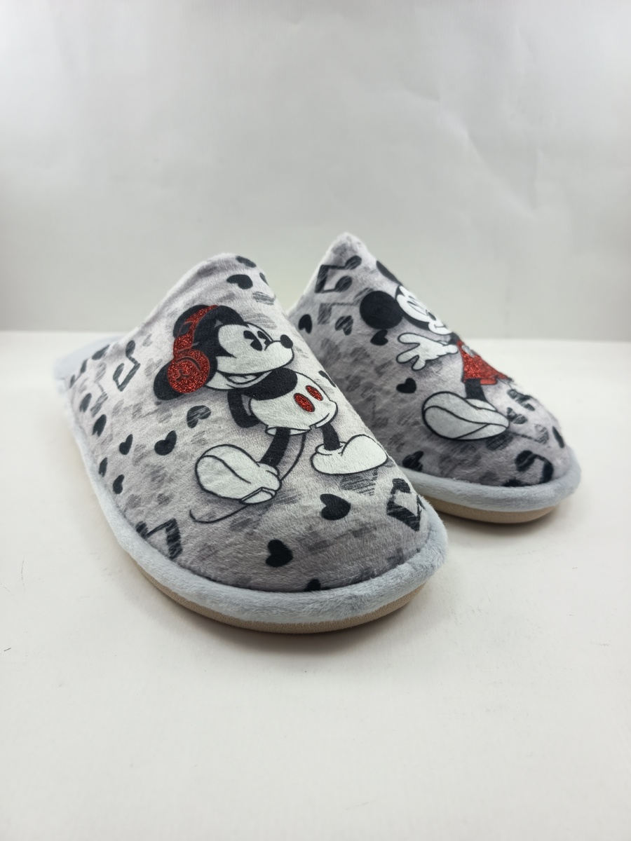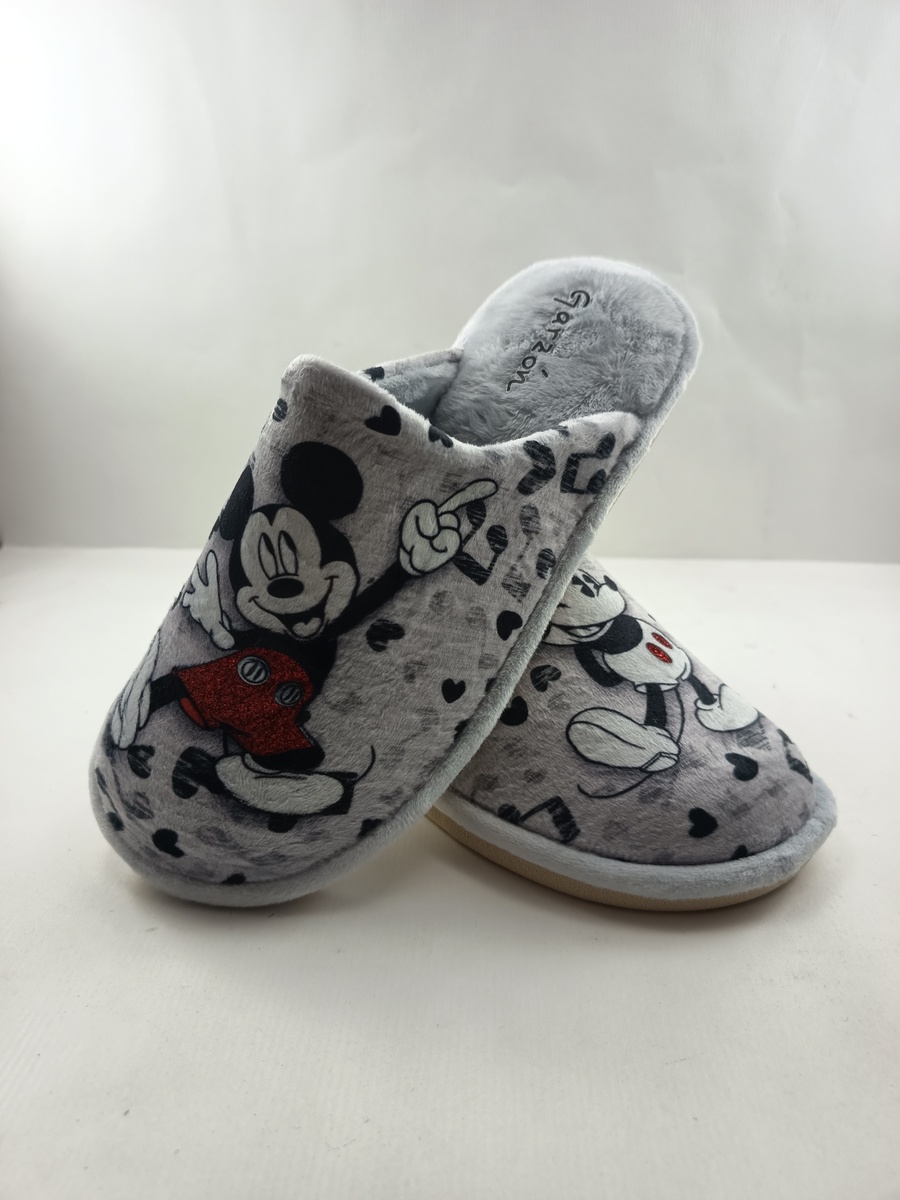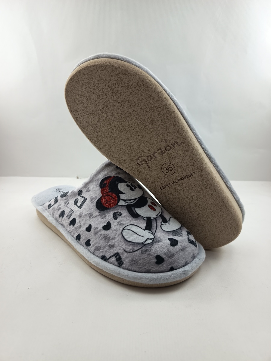 Alpargata de casa tipo chancla sintetica plata sin cierres y suela de goma, forro y plantilla textil, detalle de ratones en empeine.