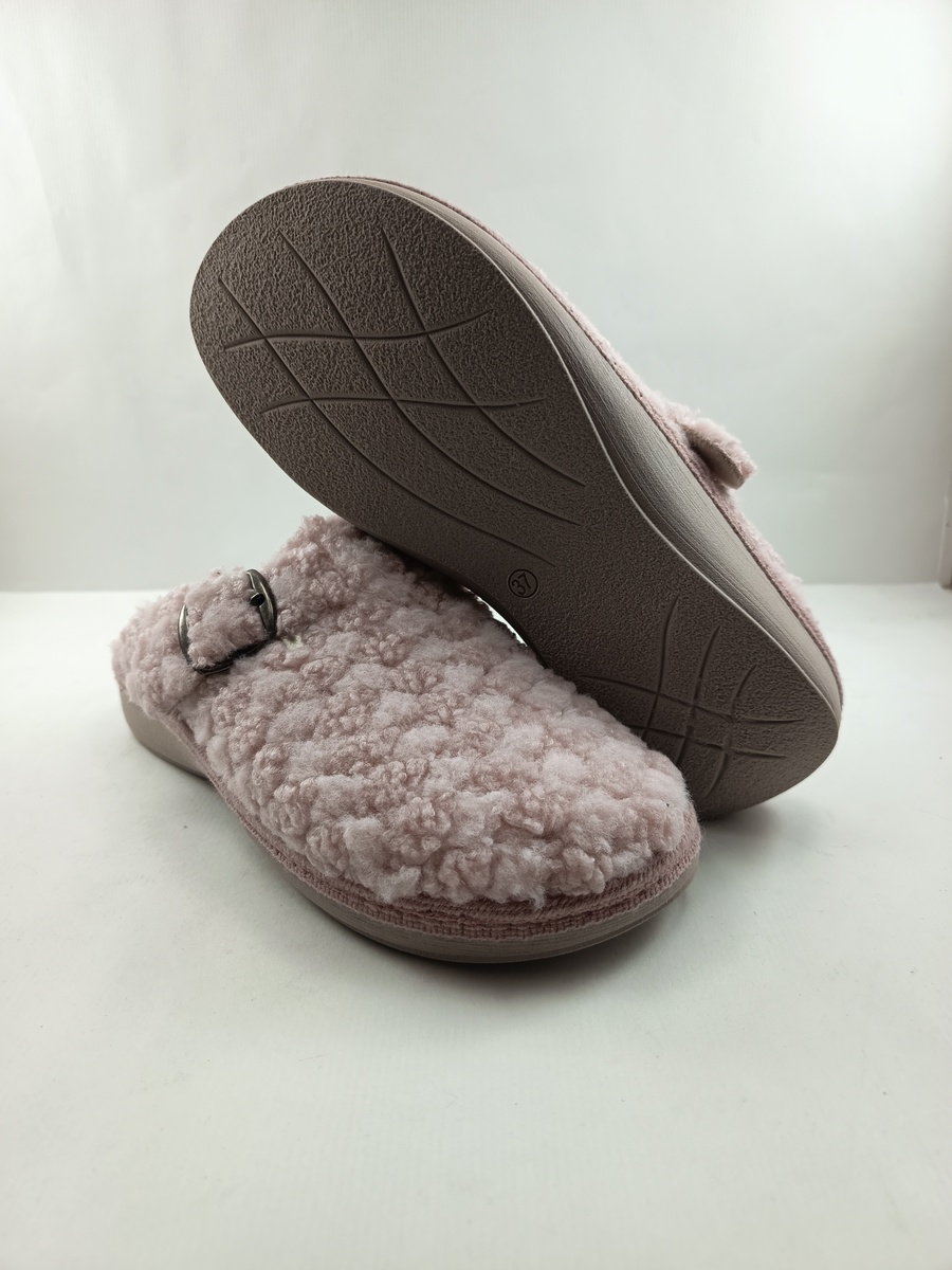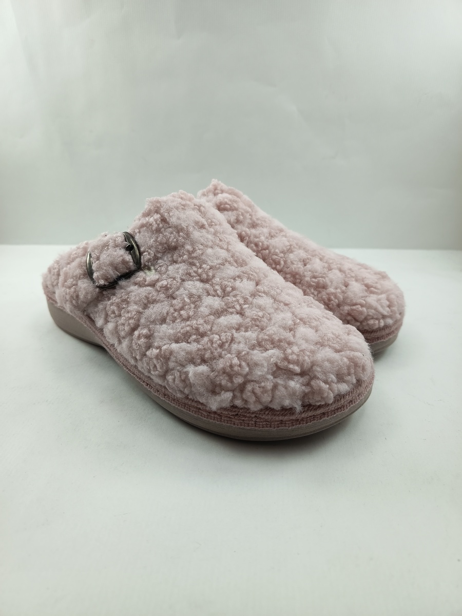 Alpargata de casa tipo chancla sintetica rosa sin cierres y suela de goma, forro y plantilla textil, detalle de hebilla en empeine.