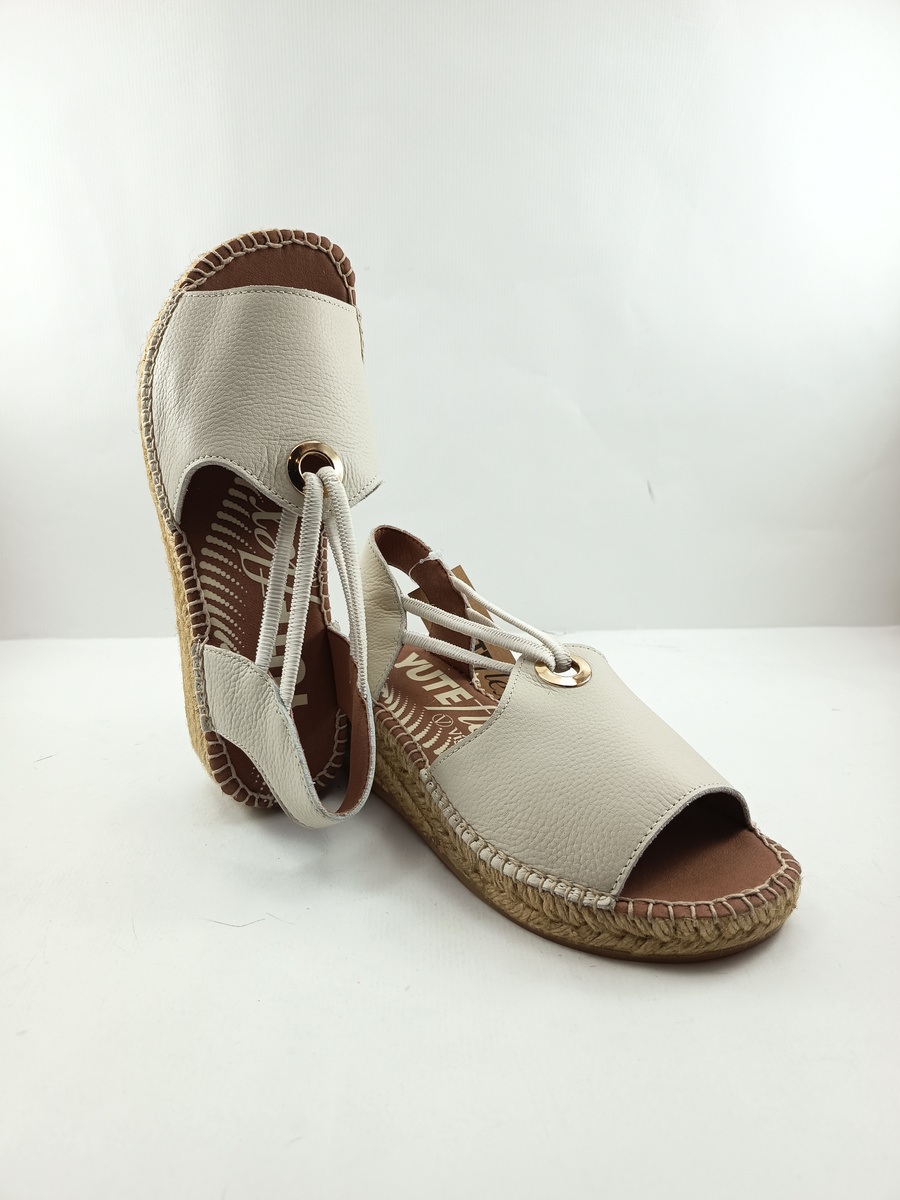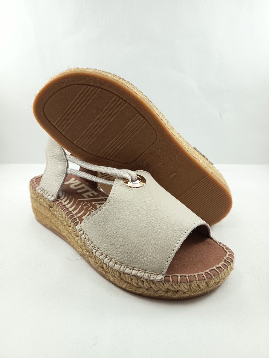 Alpargata de piel crema sin cierres y goma elastica en empeine, suela de goma y vira de yute, detalle de hojales en tira delantera que aguantan goma.