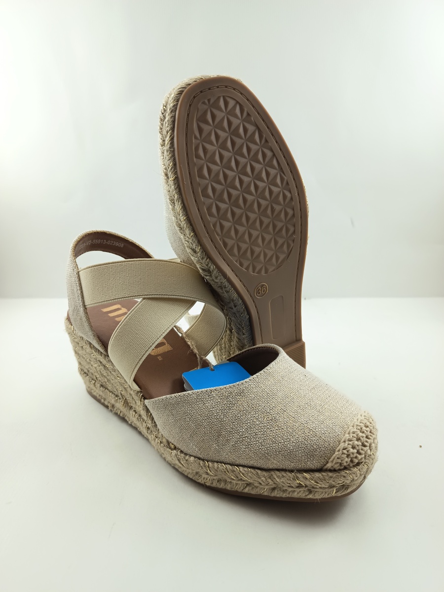 Alpargata sintetica crema sin cierres y goma elastica en empeine cruzada, suela de goma con cuña de 3, detalle de yute en vira.