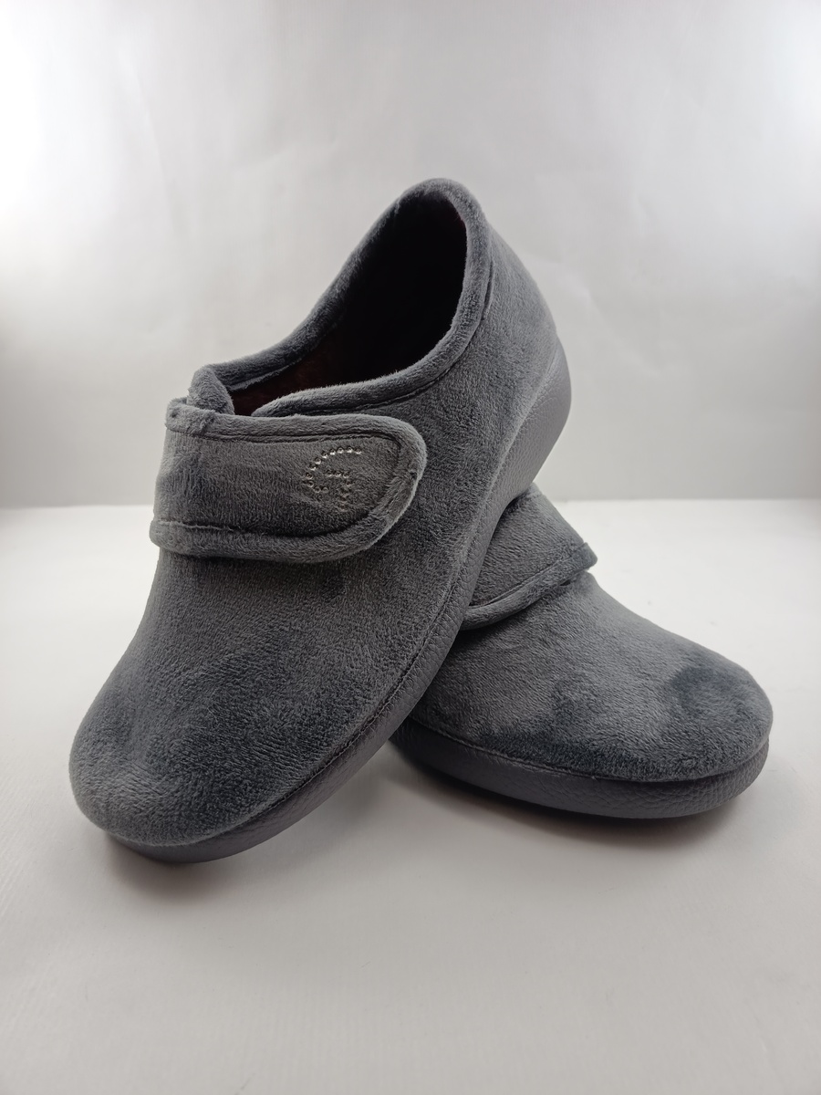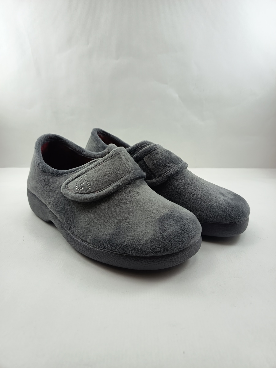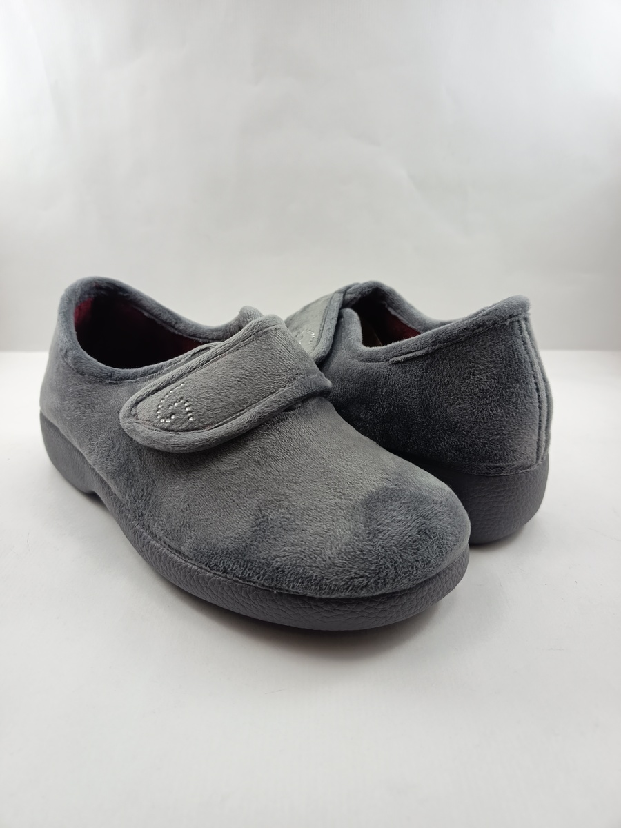 Alpargata sintetica gris con cierre de velcro y suela de goma, forro y plantilla textil.