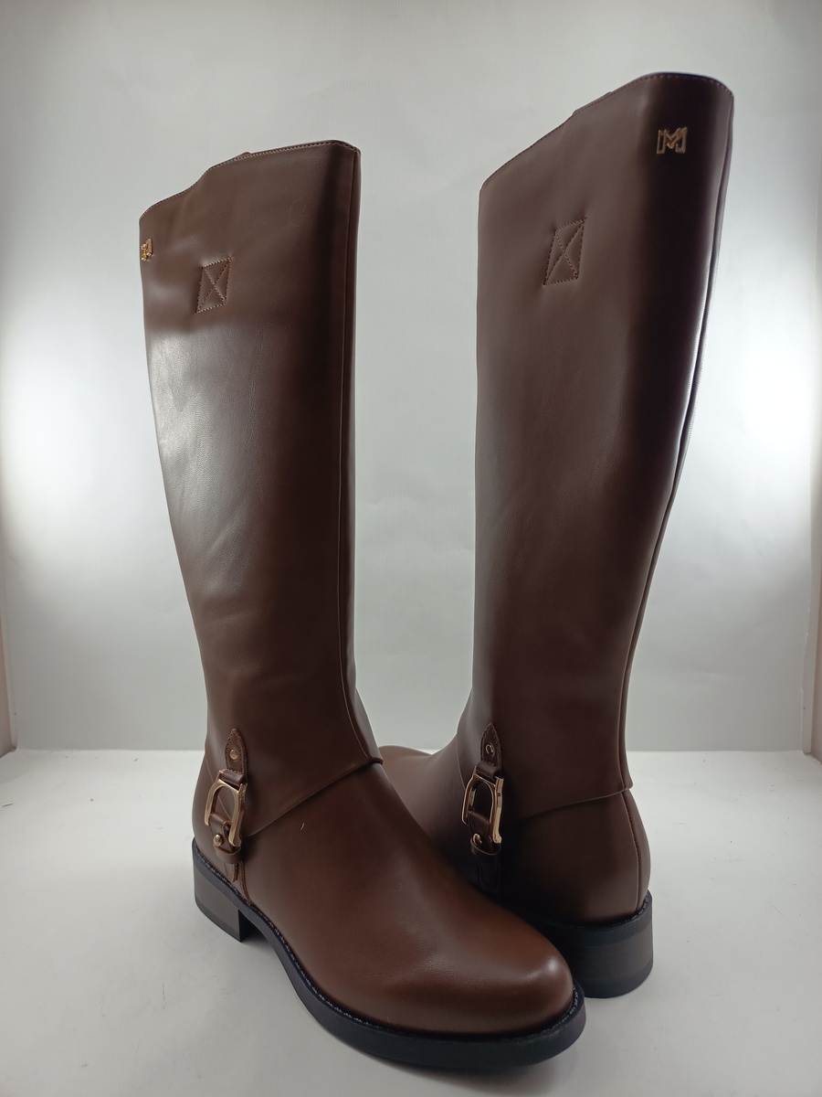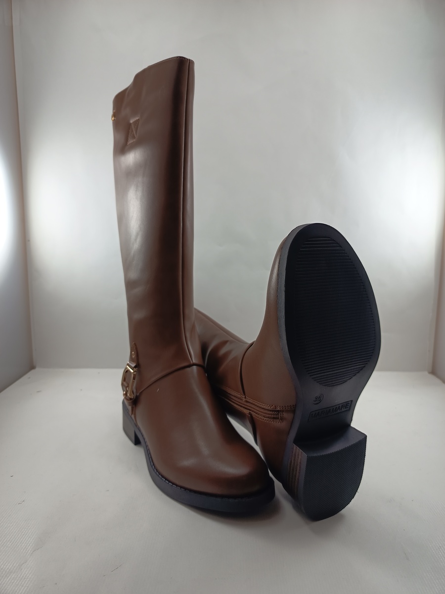 Bota alta de piel marron con cierre de cremallera y suela de goma, forro y plantilla textil, detalle de hebilla en tobillo.