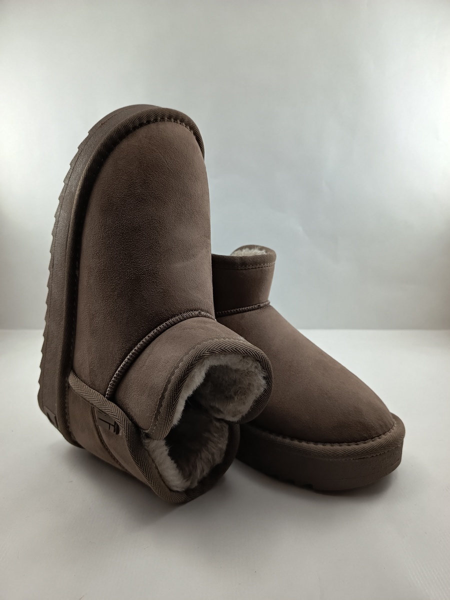 Bota australiana de ante camel sin cierres y suela de goma, forro y plantilla peludos.