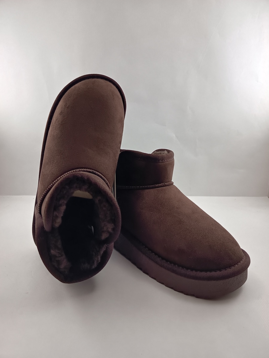 Bota australiana de ante marron sin cierres y suela de goma, forro y plantilla peludos.