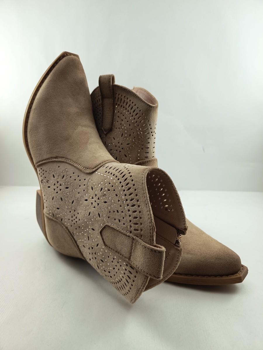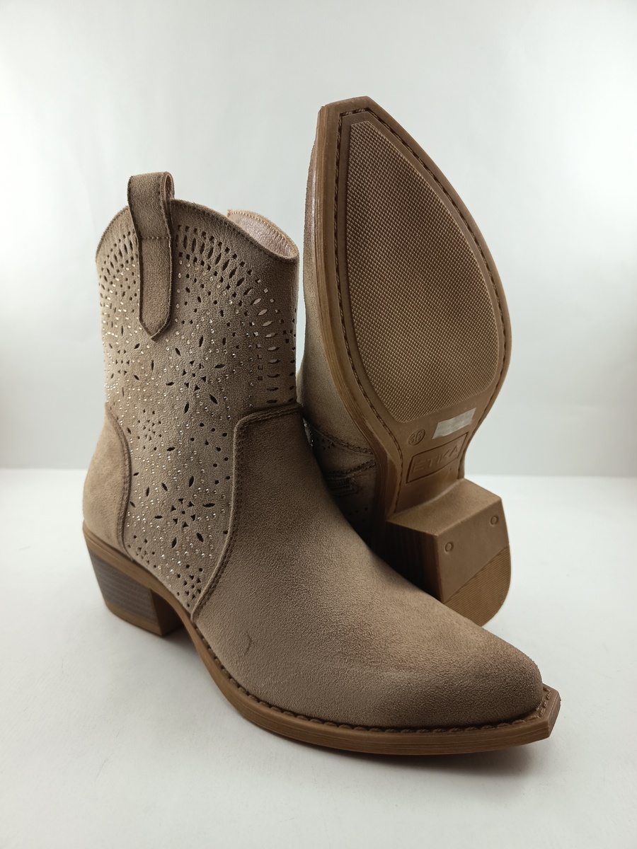 Bota campera de piel camel con cierre de cremallera y suela de goma, forro y plantilla textil, detalle de calado en laterales.