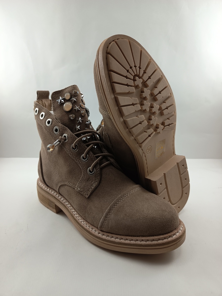 Bota de ante camel con cierre de cremallera y suela de goma, forro y plantilla de piel, detalle de cuello abierto hacia empeine.