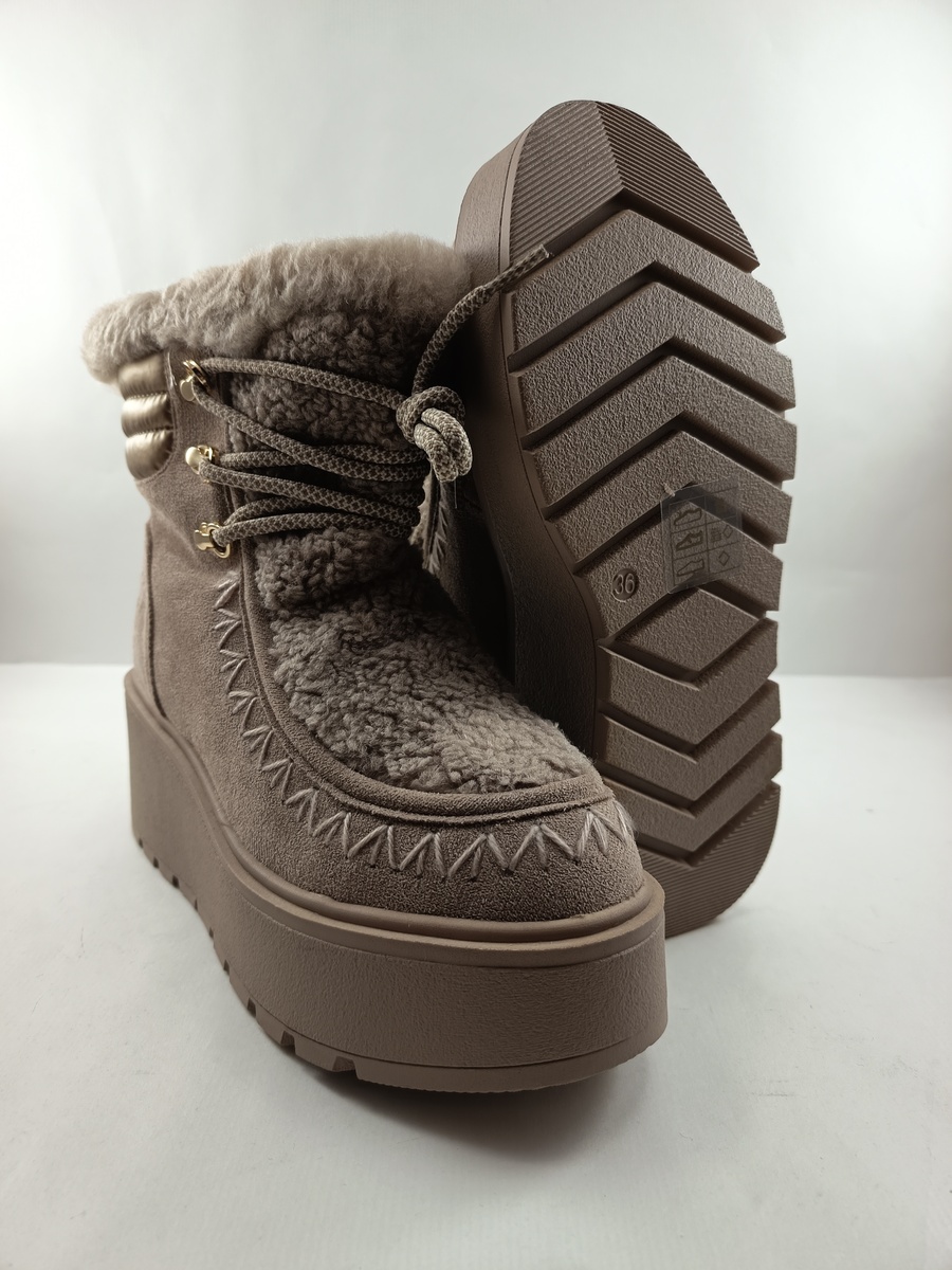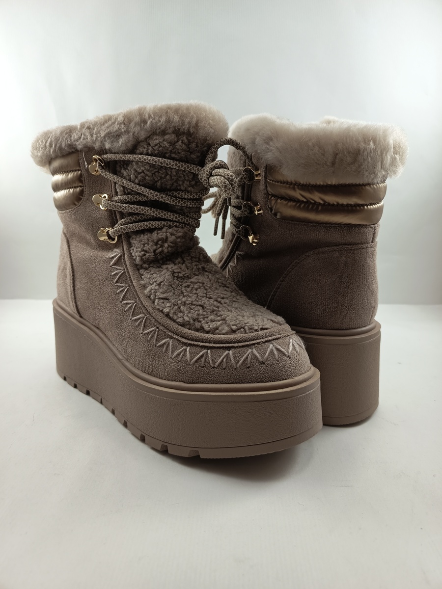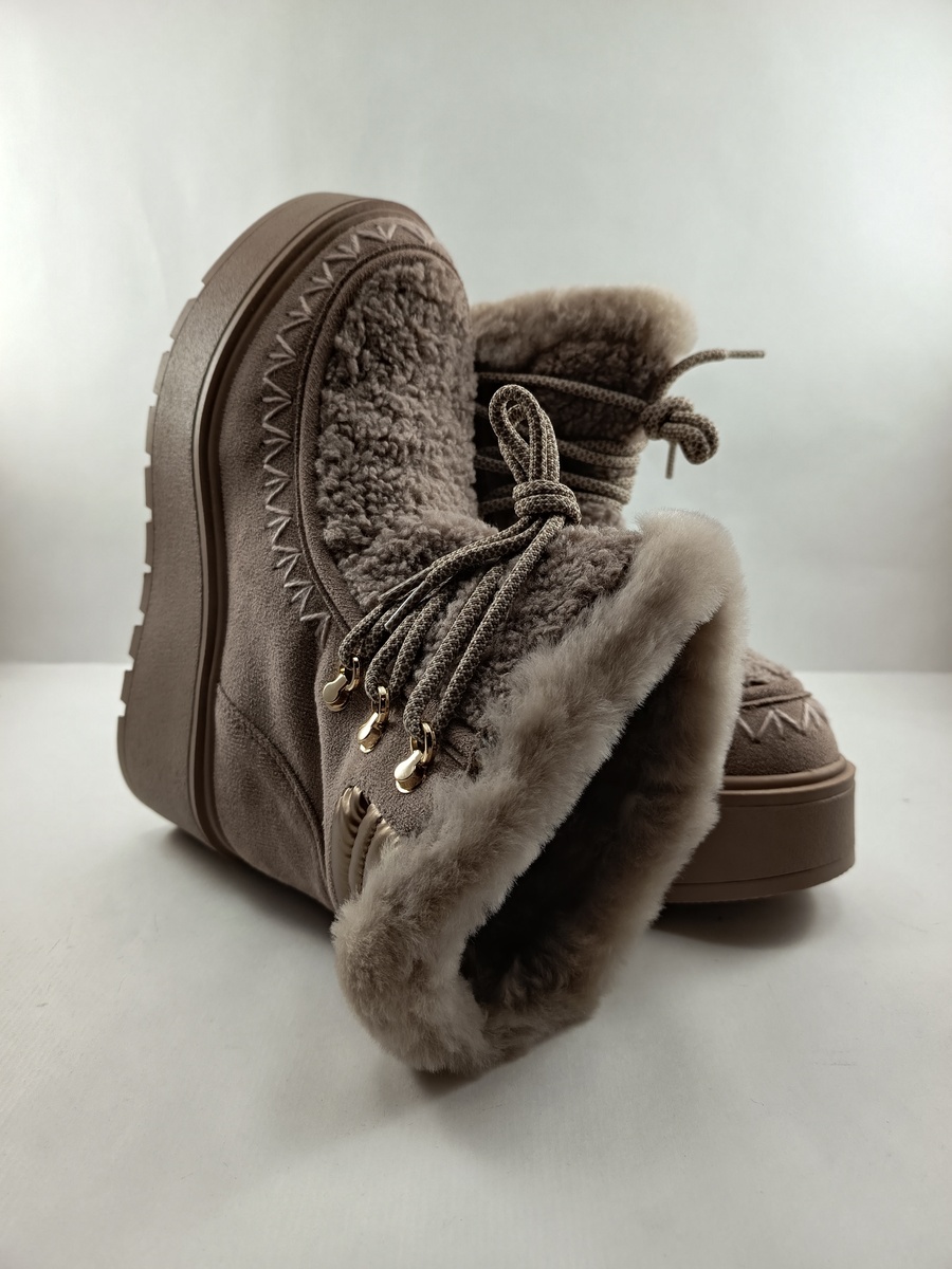 Bota de ante crema tipo australiana con cierre de cordon y suela de goma con cuña de 4, forro y plantilla textil.