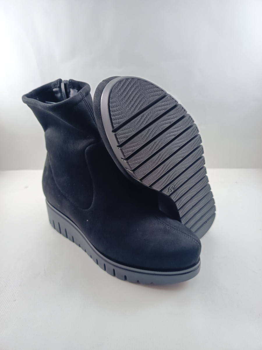 Bota de ante negro con cierre de cremallera y suela de goma con c-2, forro y plantilla de piel.