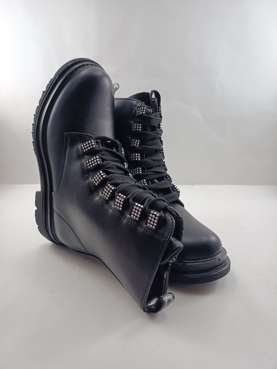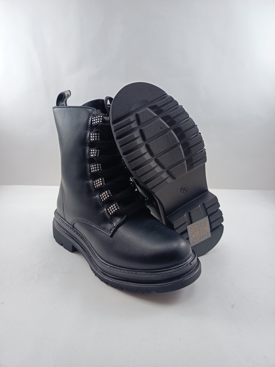 Bota de piel negra con cierre de cordon y suela de goma, forro y plantilla textil, detalle de brillos en empeine.