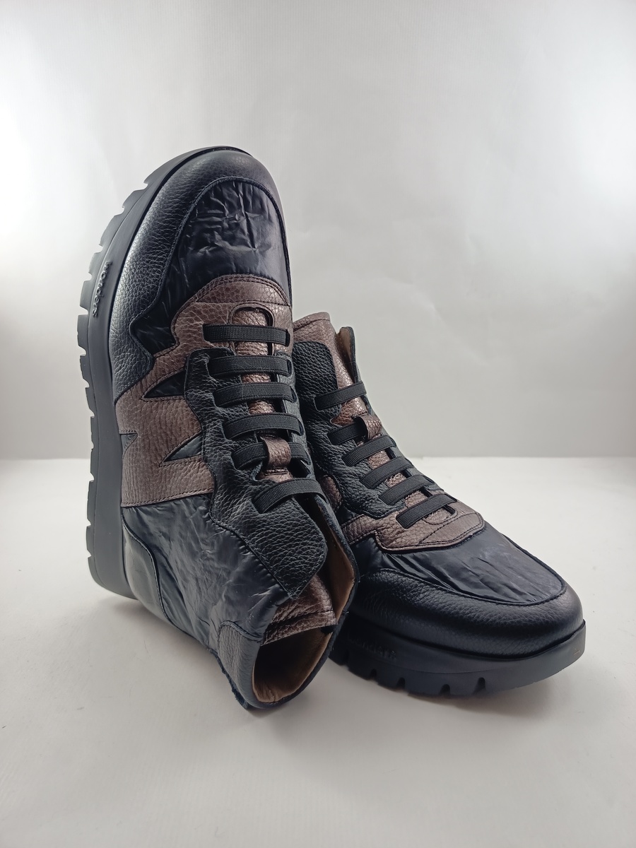 Bota de piel negra con cierre de cordon elastico y suela de goma, forro y plantilla de piel.