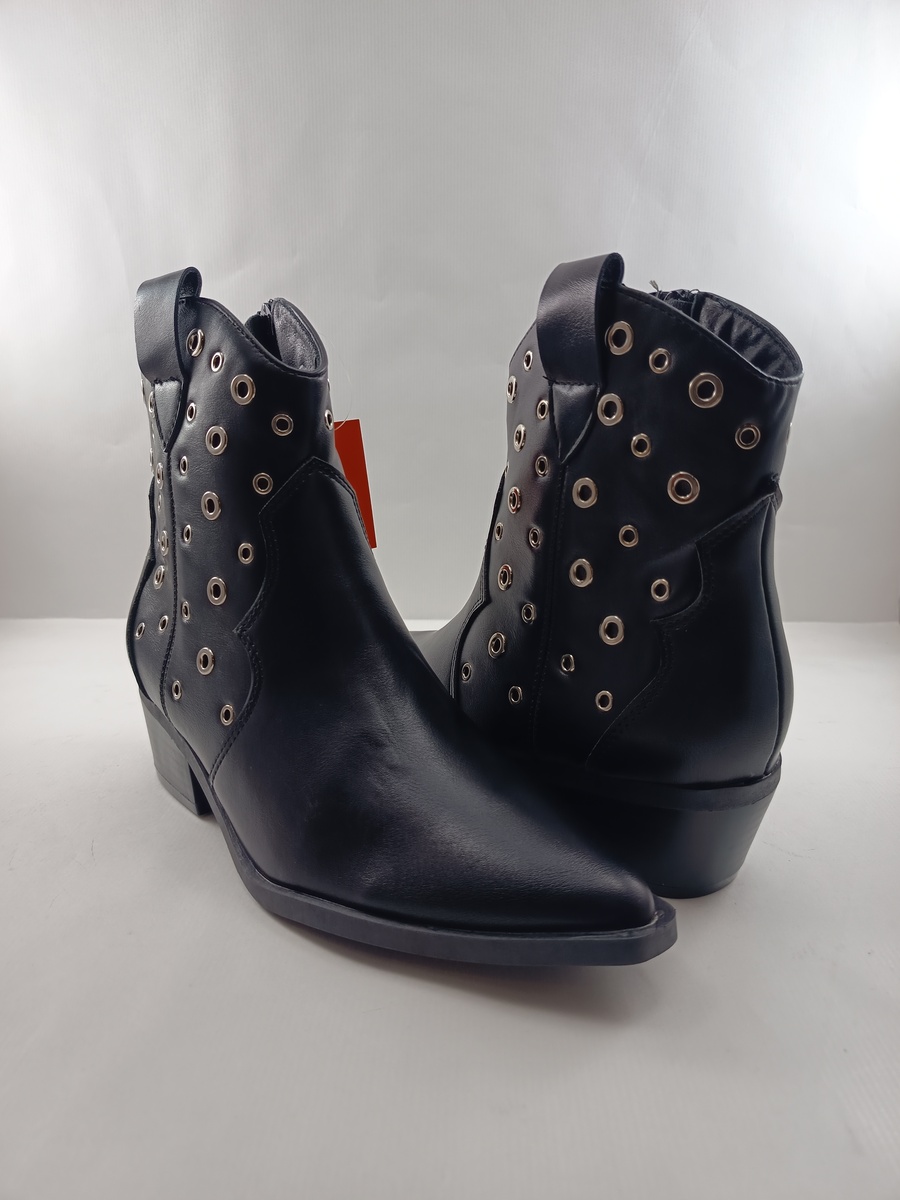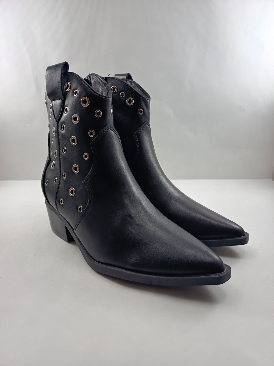 Bota tipo campera de piel negra con cierre de cremallera y suela de goma con tacon de 2, forro y plantilla textil, detalle de tachas en toda ella.