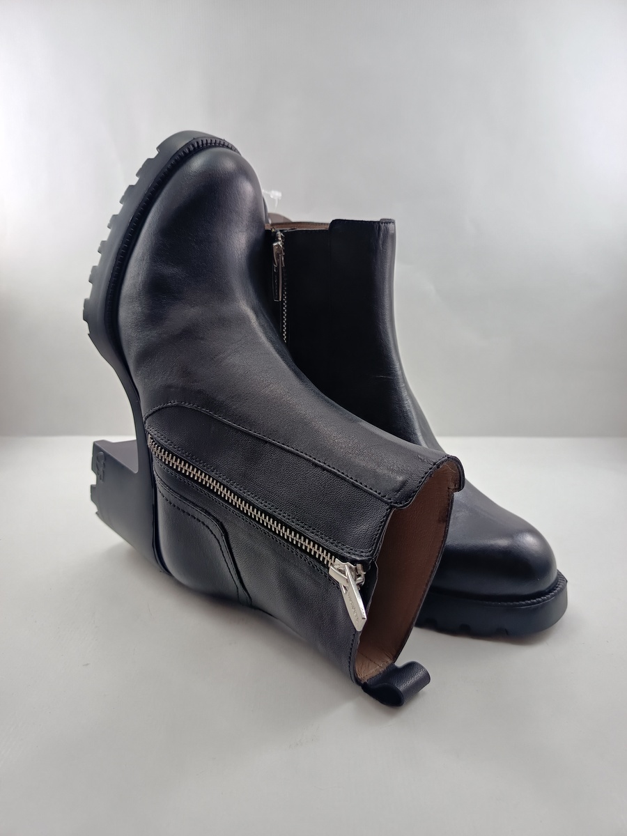 Bota de piel negra con cierre de cremallera y suela de goma con tacon de 3, forro y plantilla de piel.