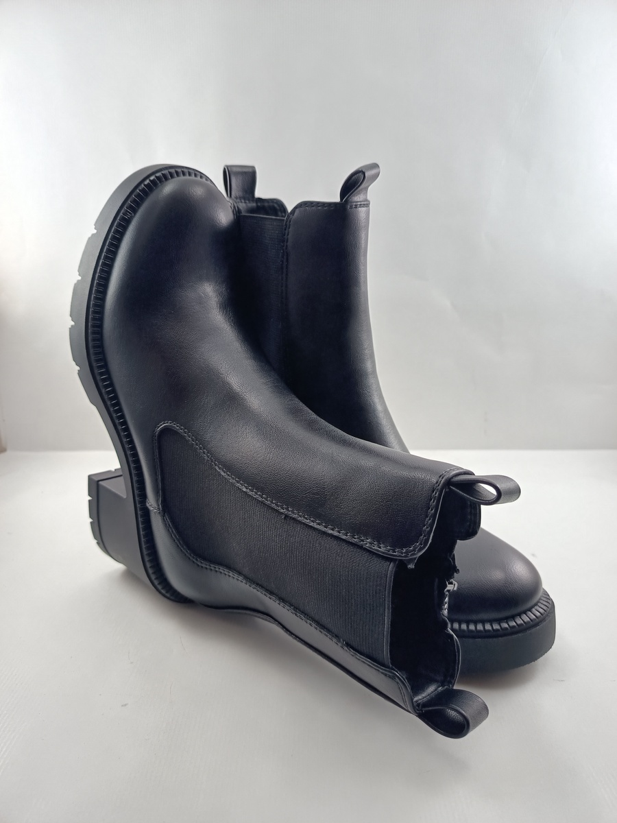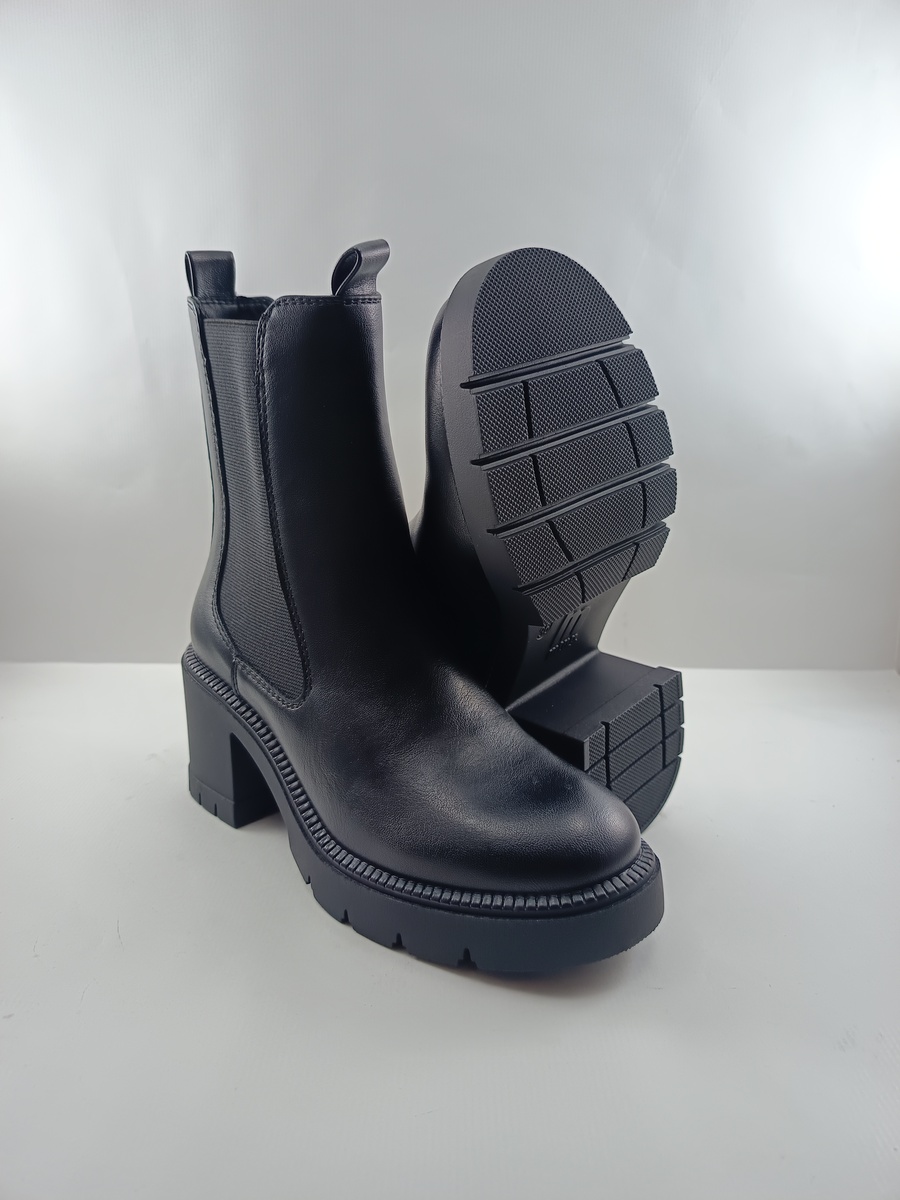 Bota de piel negra con goma elastica en laterales y suela de goma con tacon de 3, forro y plantilla textil.