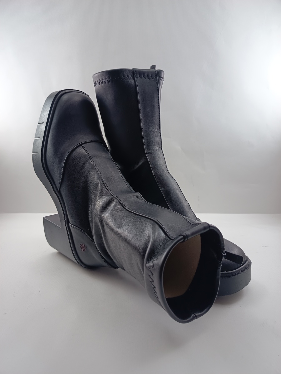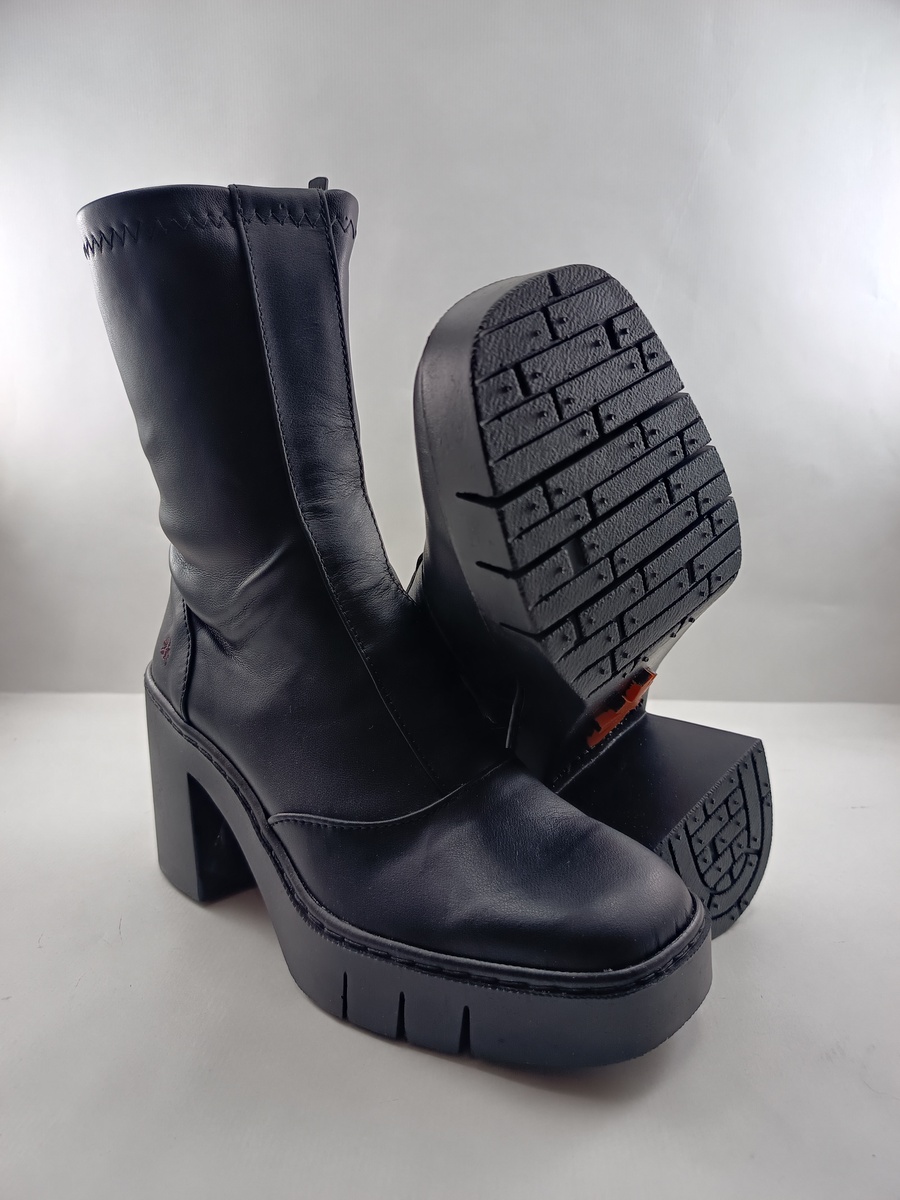 Bota de piel negra sin cierres y suela de goma con tacon de 3, forro y plantilla de piel.