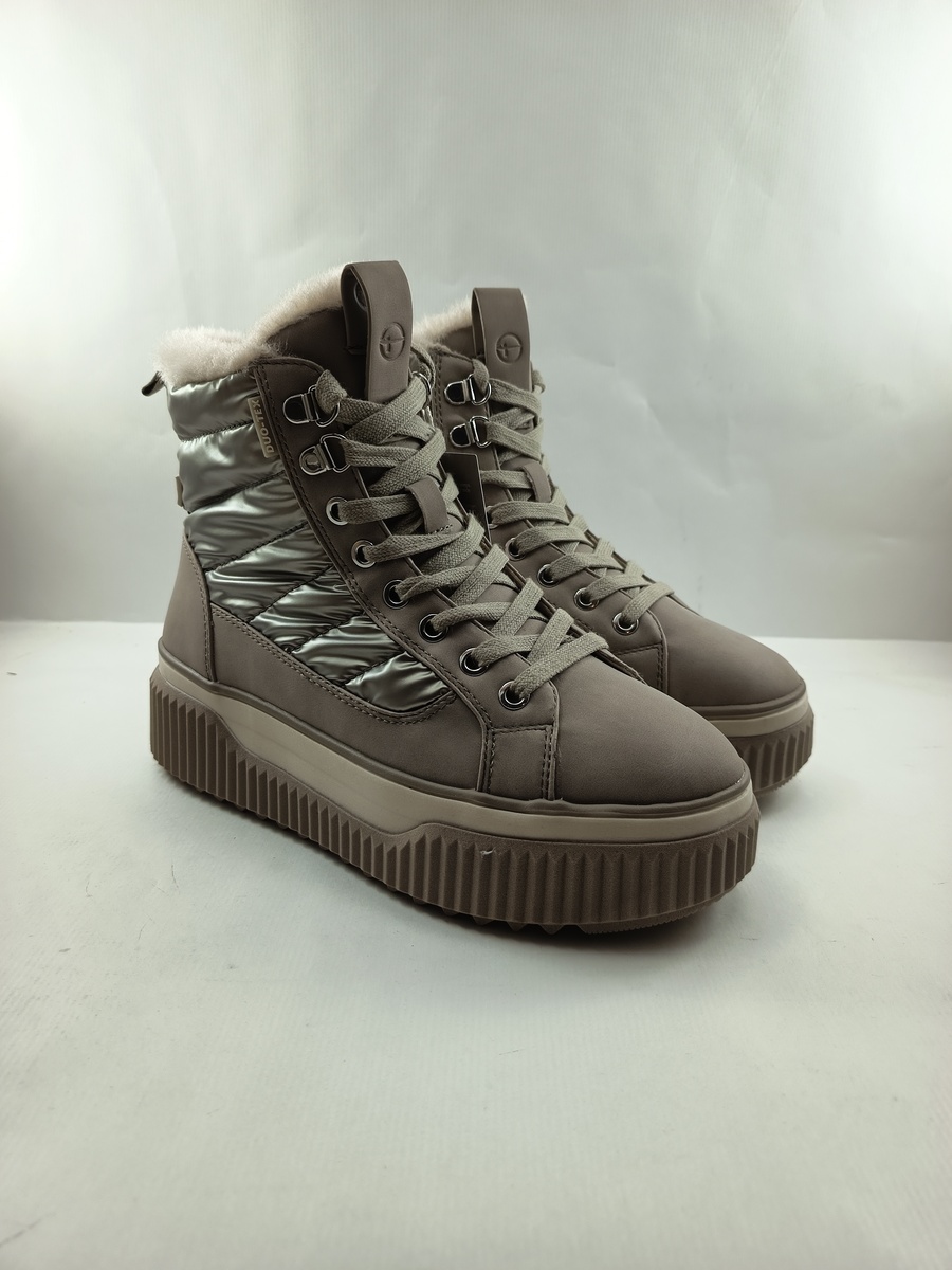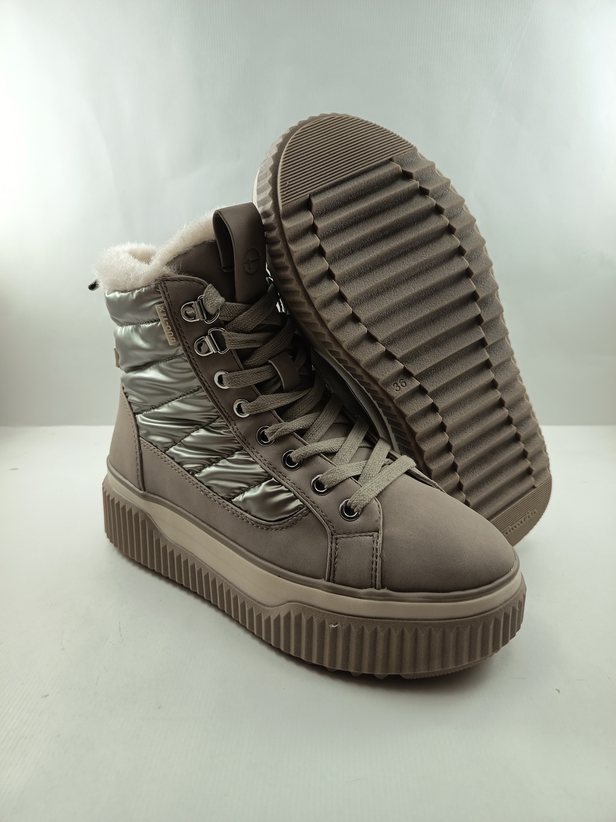 Bota de piel oro con cierre de cordon y suela de goma, forro y plantilla textil, detalle de vira en blanco.