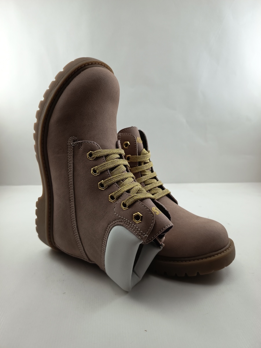 Bota de piel rosa con cierre de cordon y suela de goma, forro y plantilla textil, detalle de cordon en dorado y cuello en blanco.
