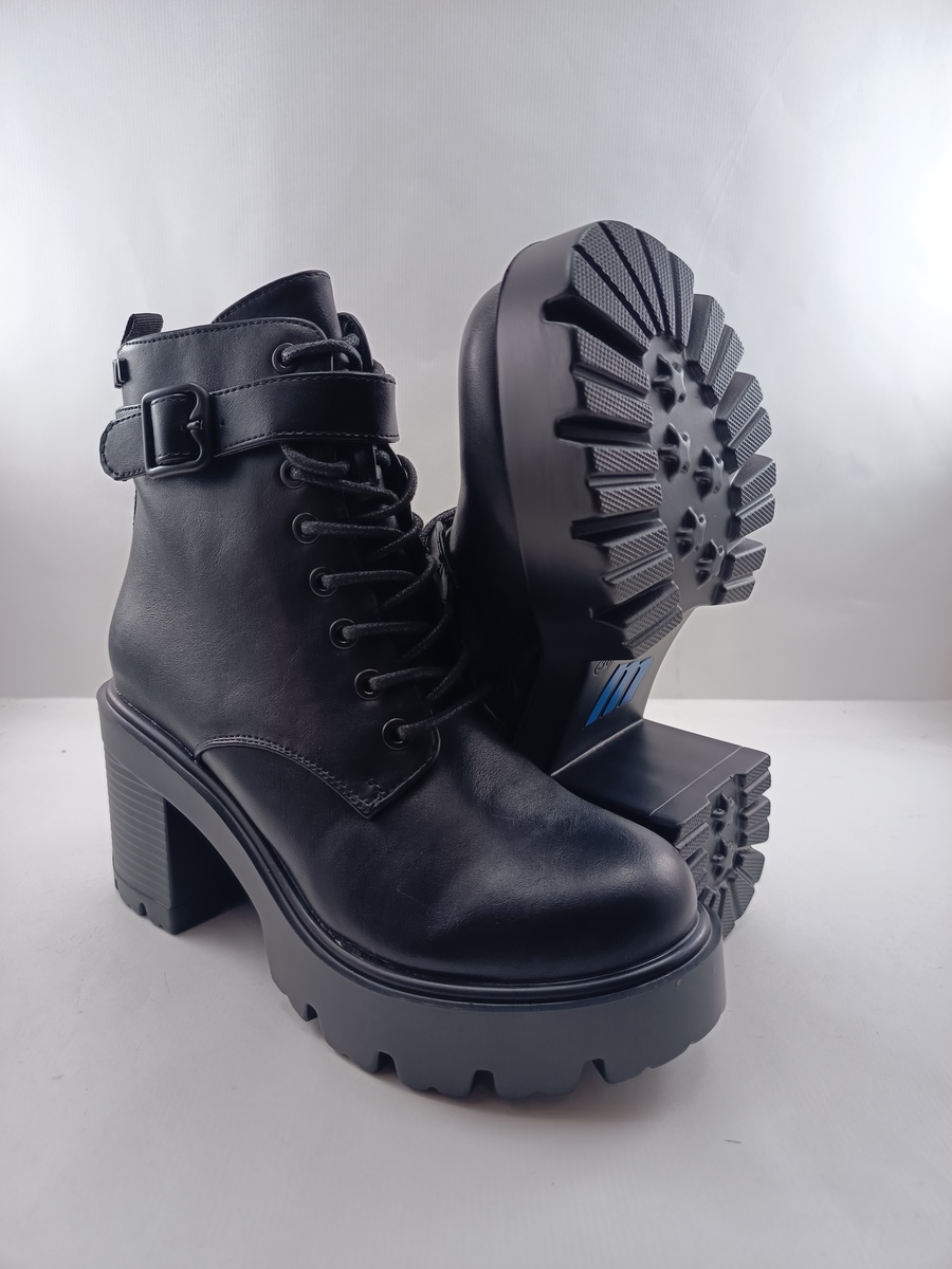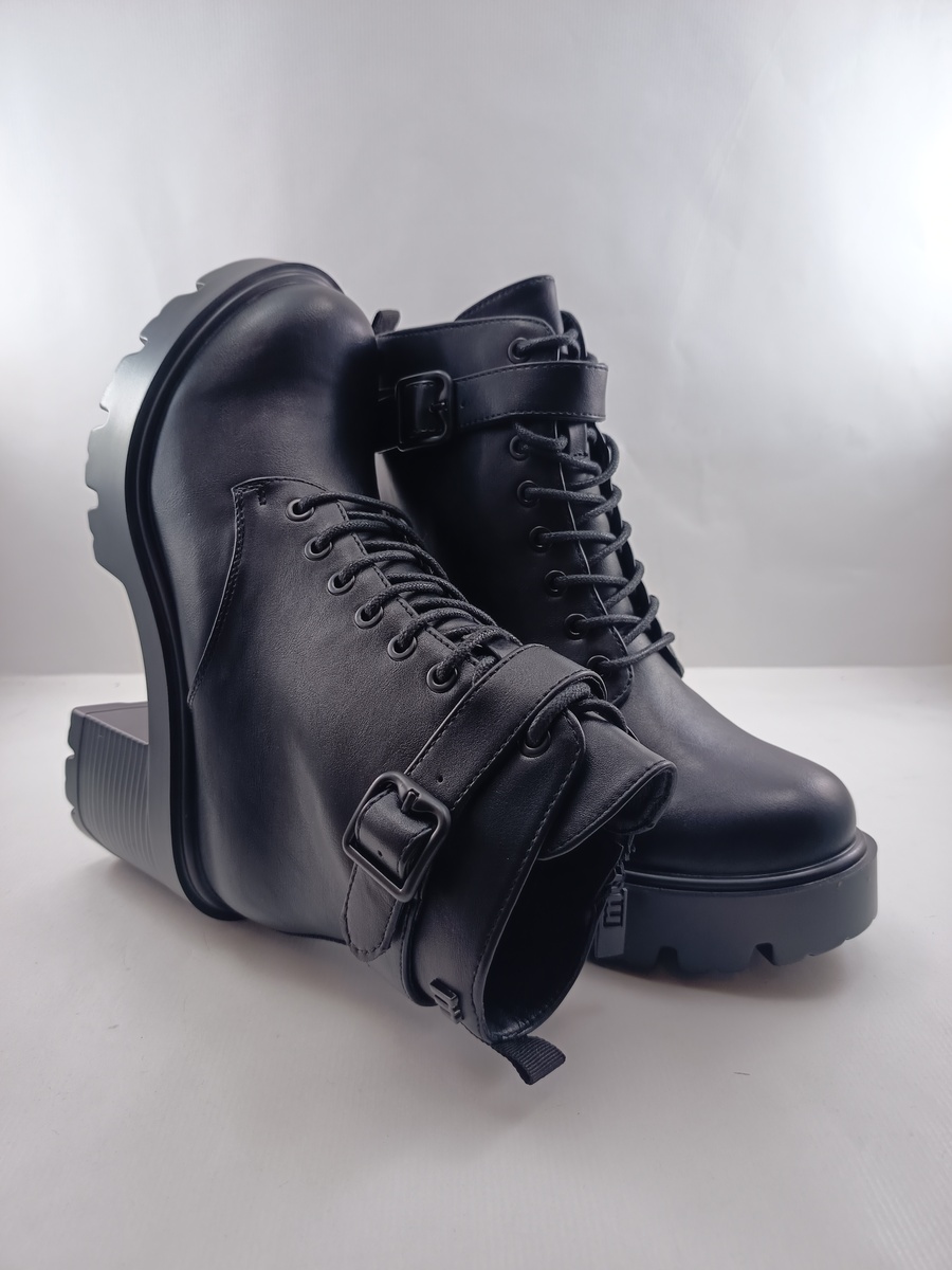 Bota estilo militar de piel negra con cierre de cordon y suela de goma con tacon de 3, forro y plantilla textil, detalle de cinturon por encima tobillo.