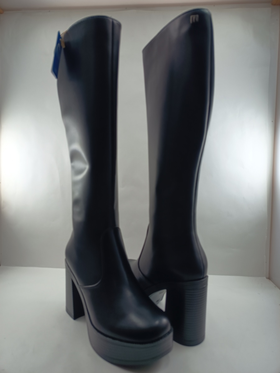 Bota larga de piel negra con cierre de cremallera en lateral interior y suela de goma con tacon de 5 y plataforma delantera para una mayor comodidad.