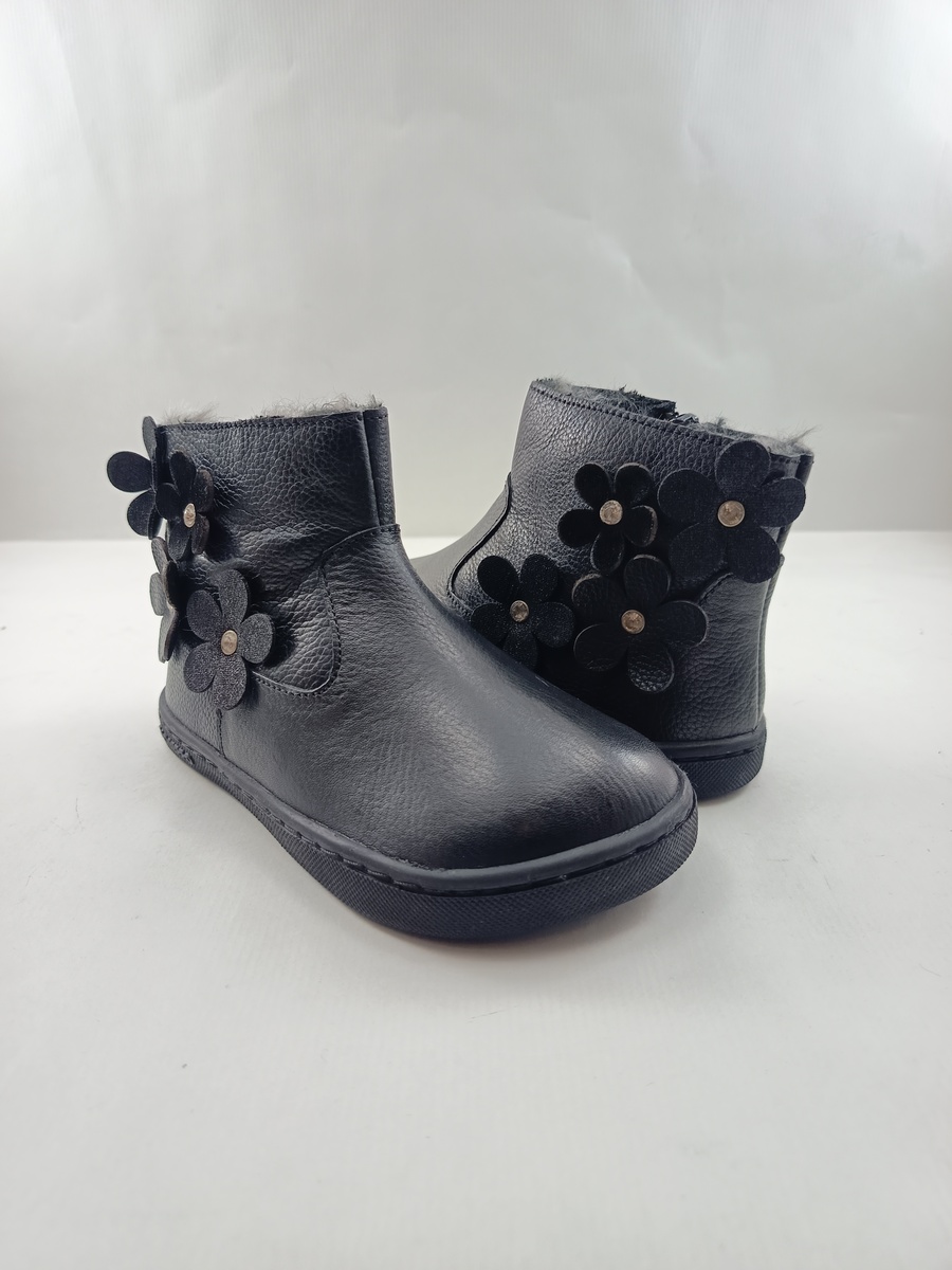 Bota sintetica negra con cierre de cremallera y suela de goma, forro y plantilla textil, detalle de flores en lateral exterior.