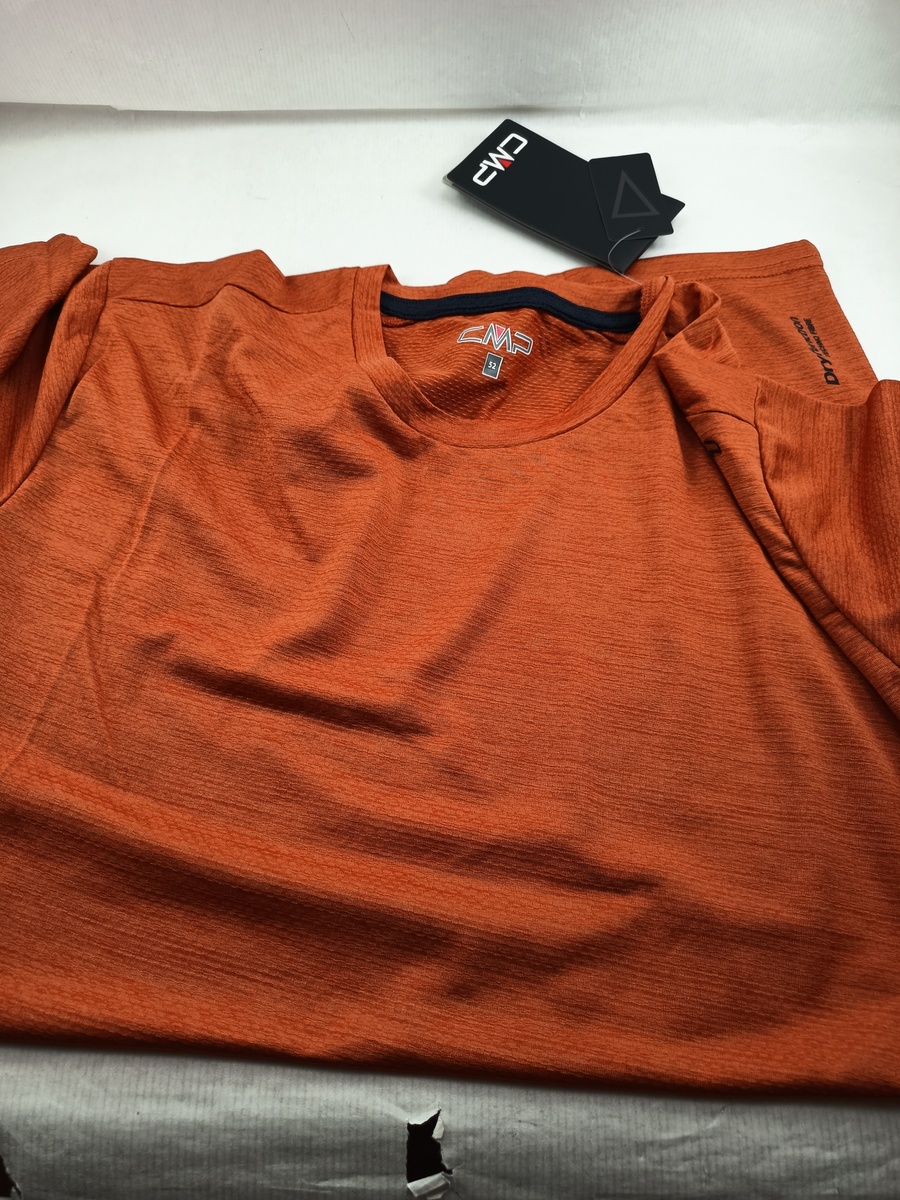 Camiseta textil naranja sin cierres y cuello redondeado.