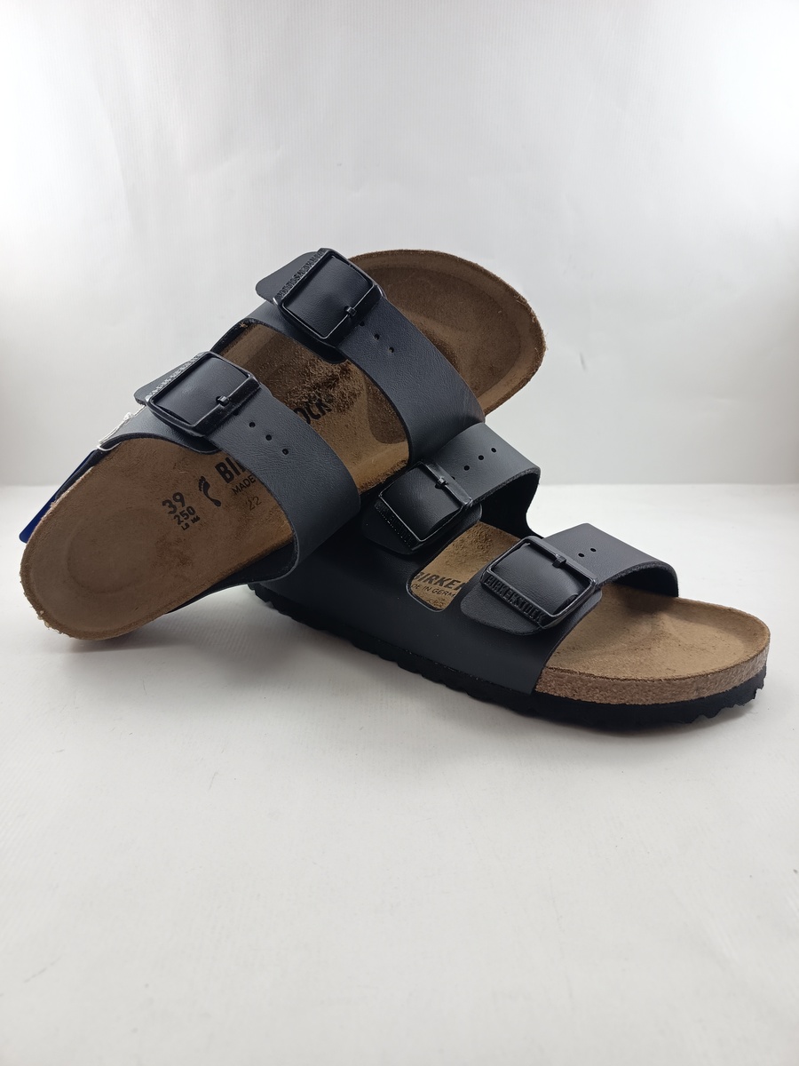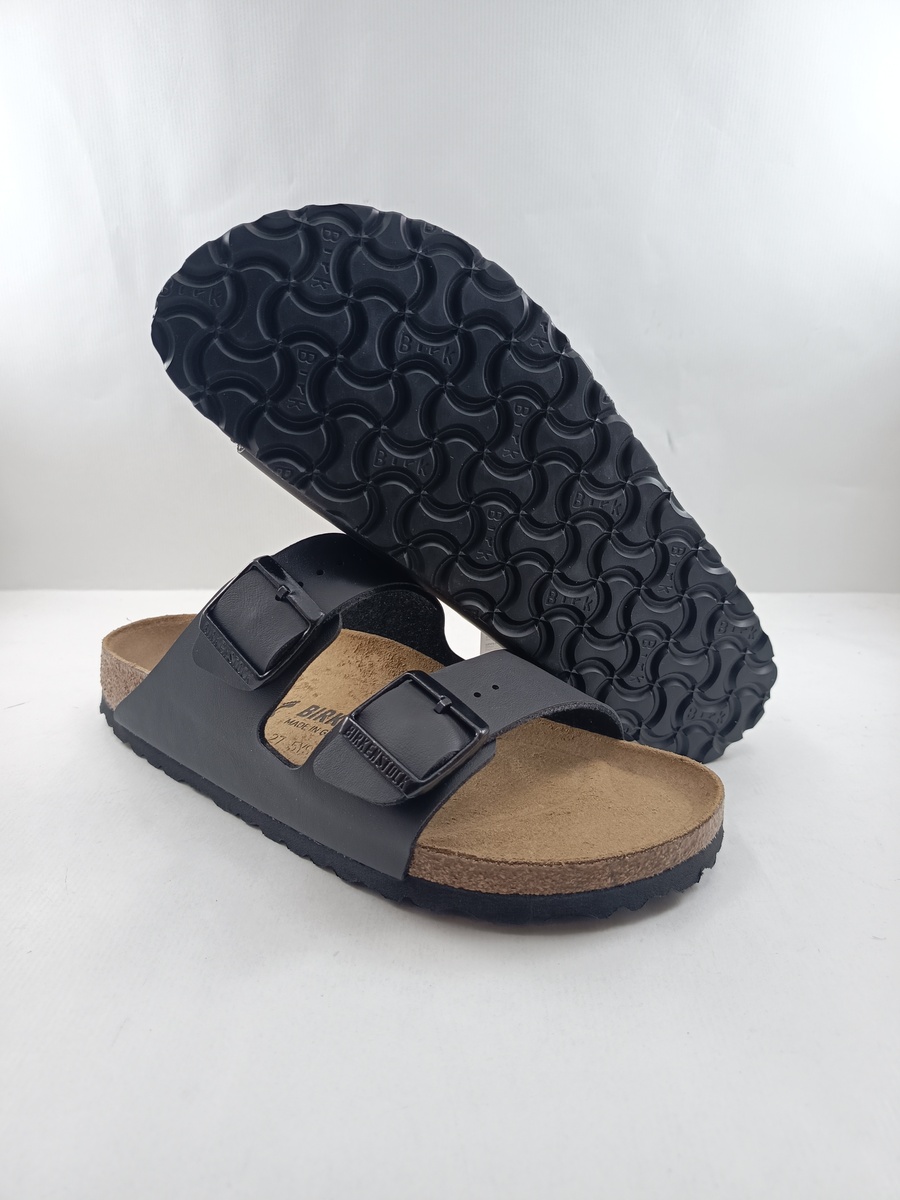 Chancla de piel negra con cierre de doble hebilla, Birkenstock mod. Arizona