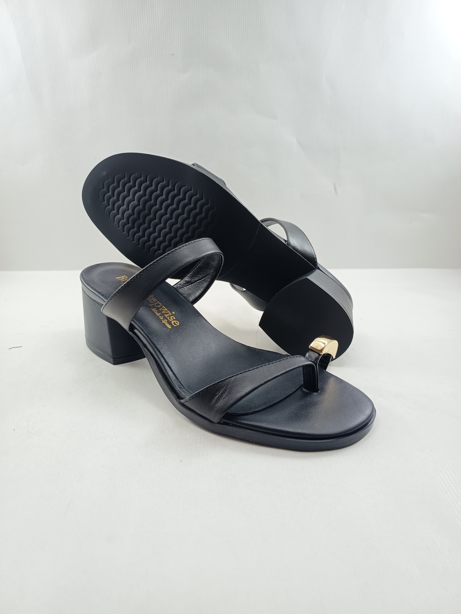 Chancla de piel negra con tiras en dedos y empeine y suela de goma con tacon de 3, forro y plantilla de piel, detalle de pieza dorada en dedos.