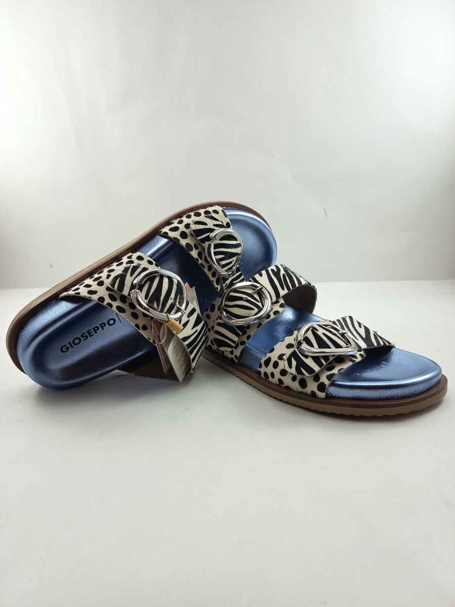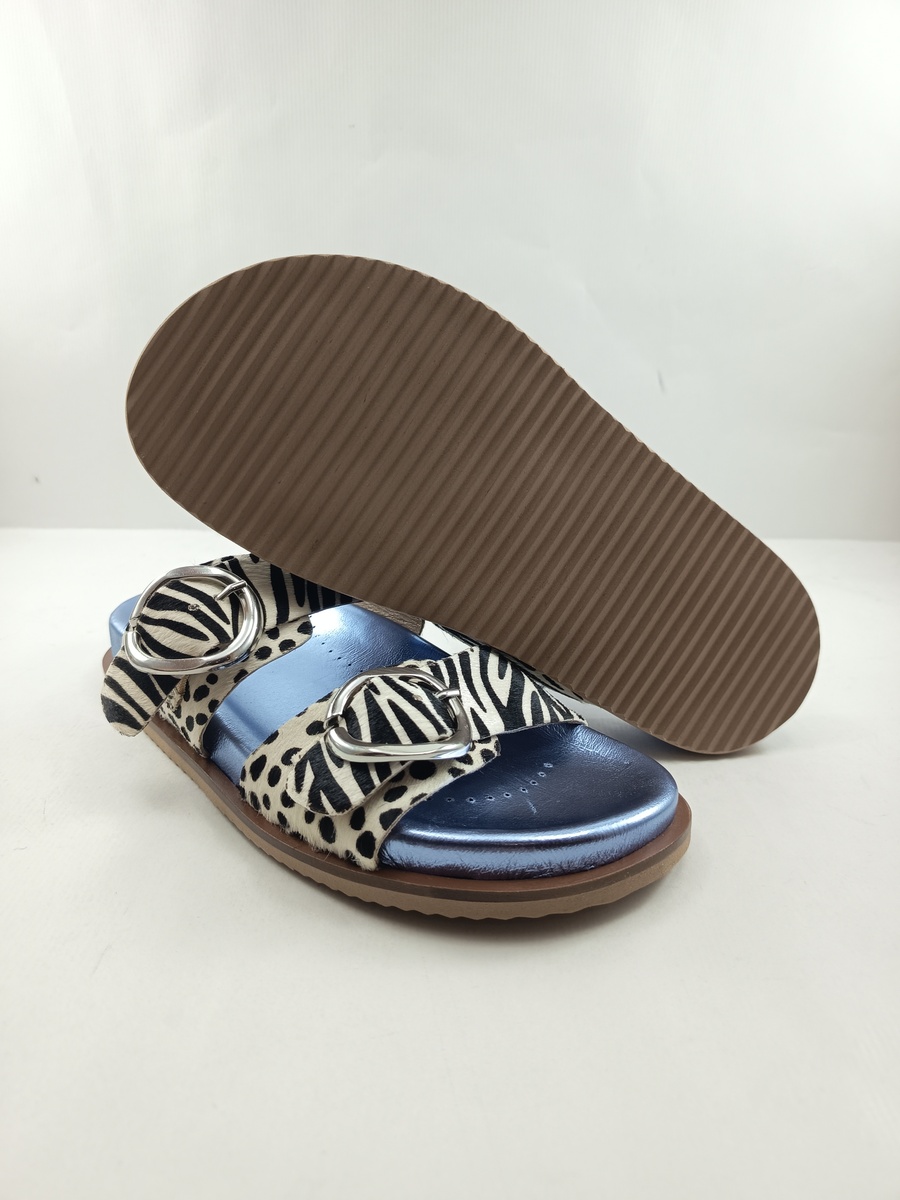 Chancla sintetica azul con cierres de hebillas en tiras y suela de goma, forro y plantilla sinteticos, detalle de animal print en tiras.