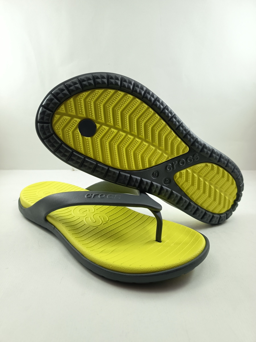 Chancla sintetica gris sin cierres y tiras cruzada, suela de goma, detalle de plantilla en amarillo.