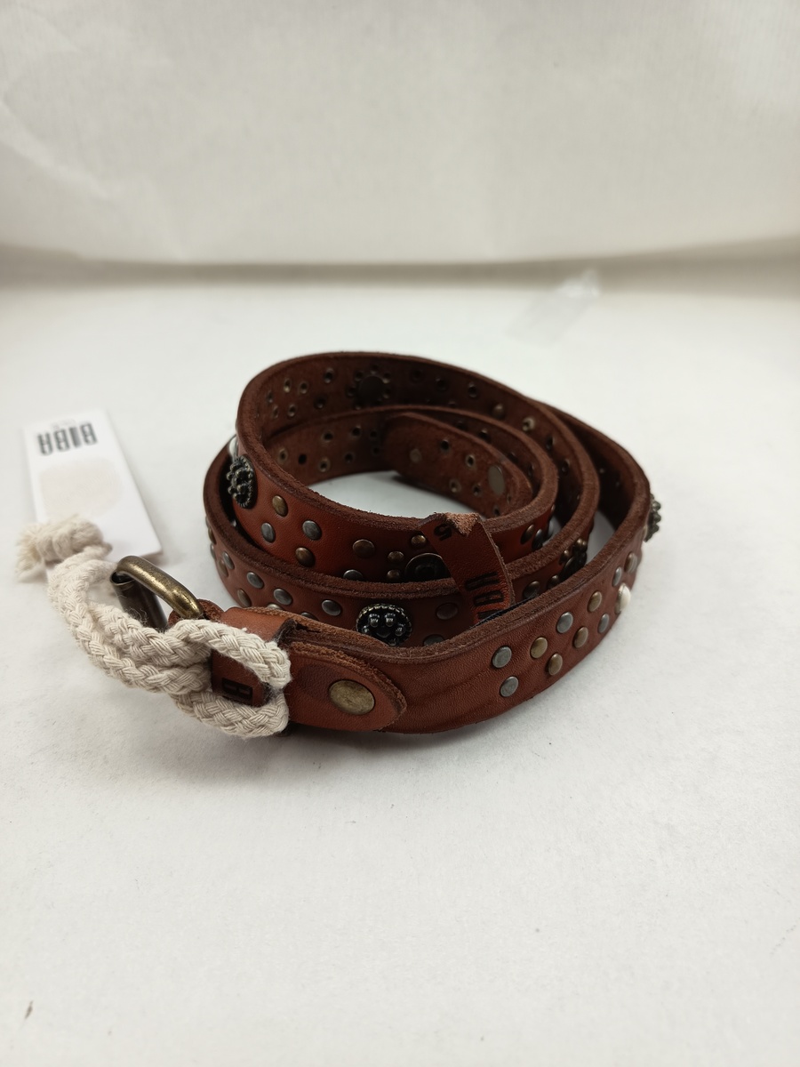 Cinturon de piel cuero con cierre de hebilla y detalle de tachas pequeñas y grandes en el.