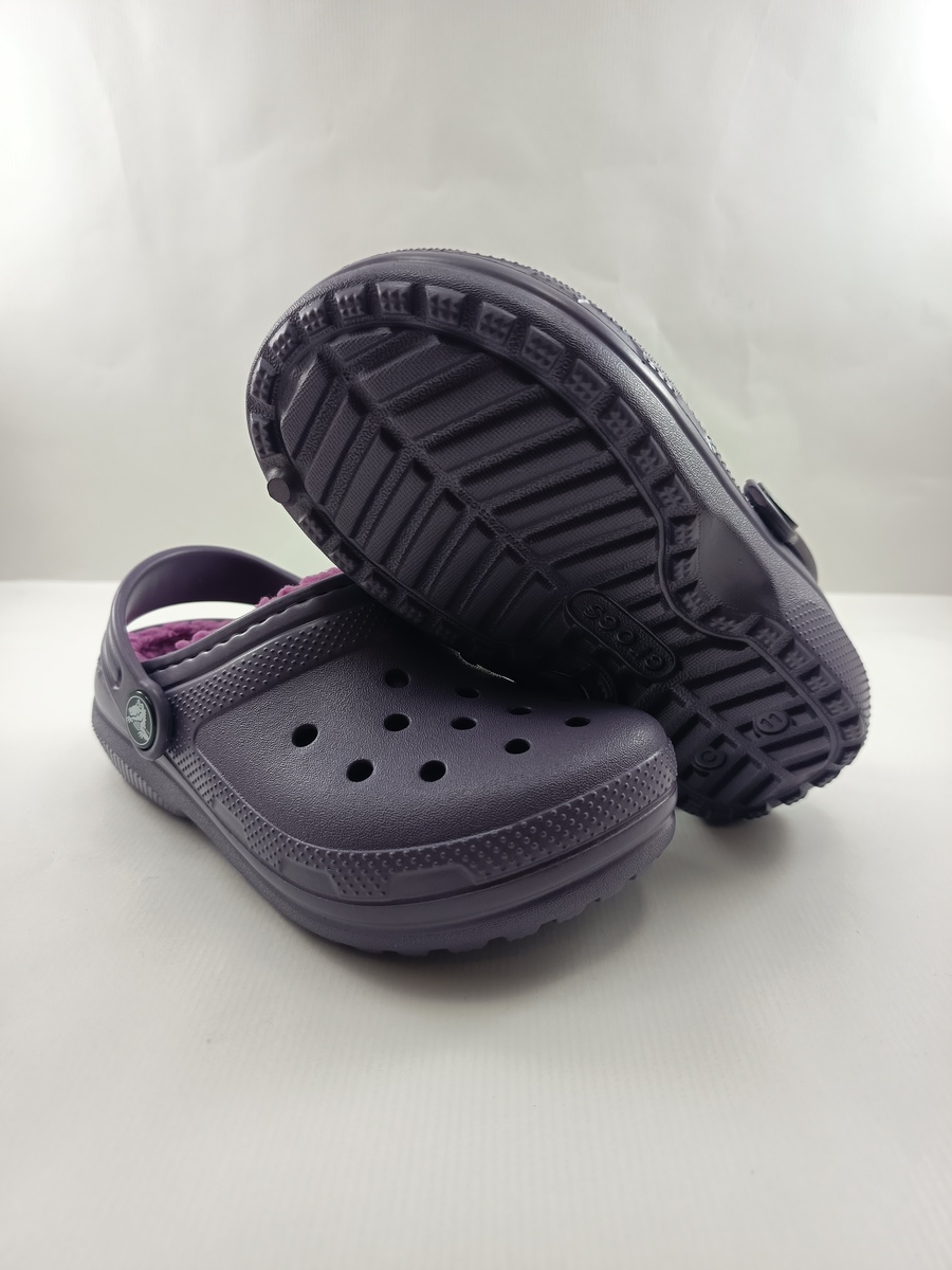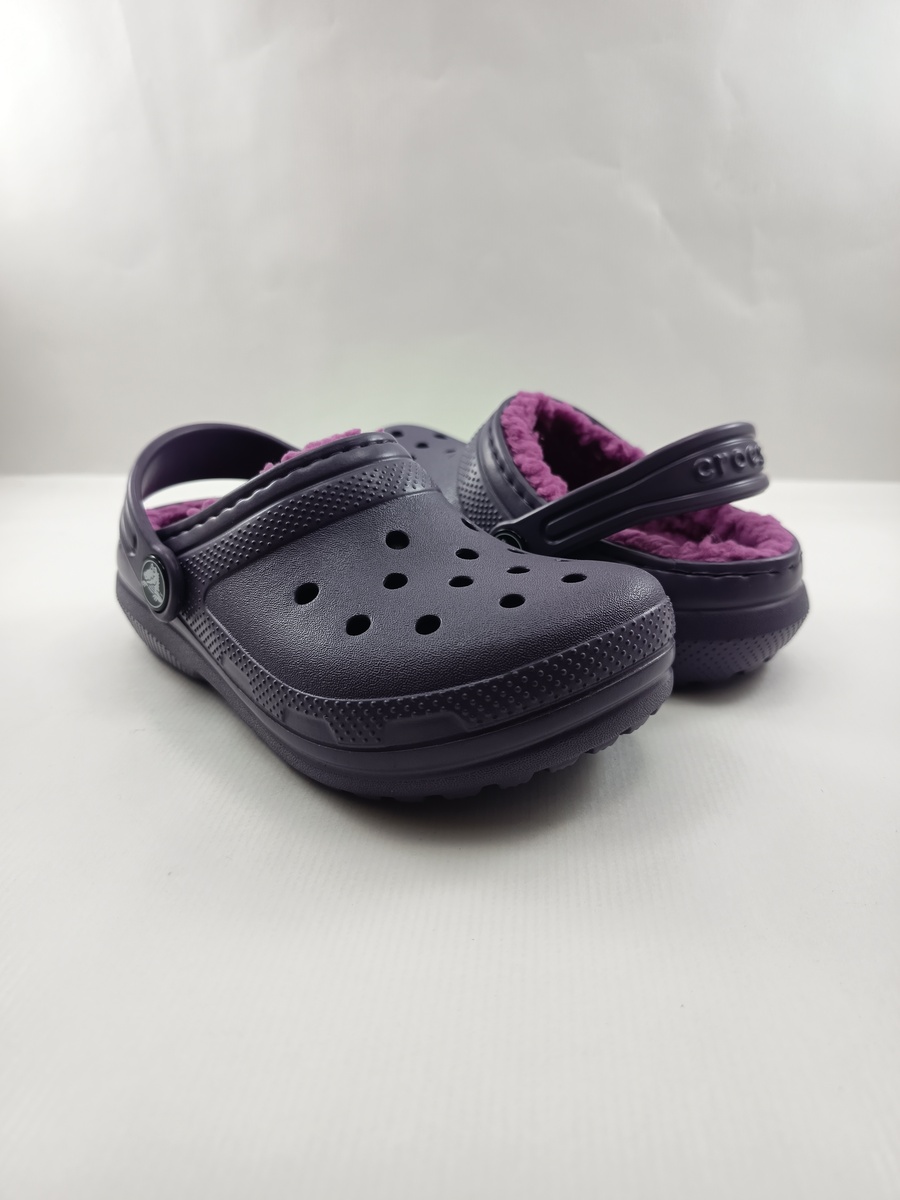Croc classico lined lila sin cierres y tira trasera, suela de goma, forro de borreguito.