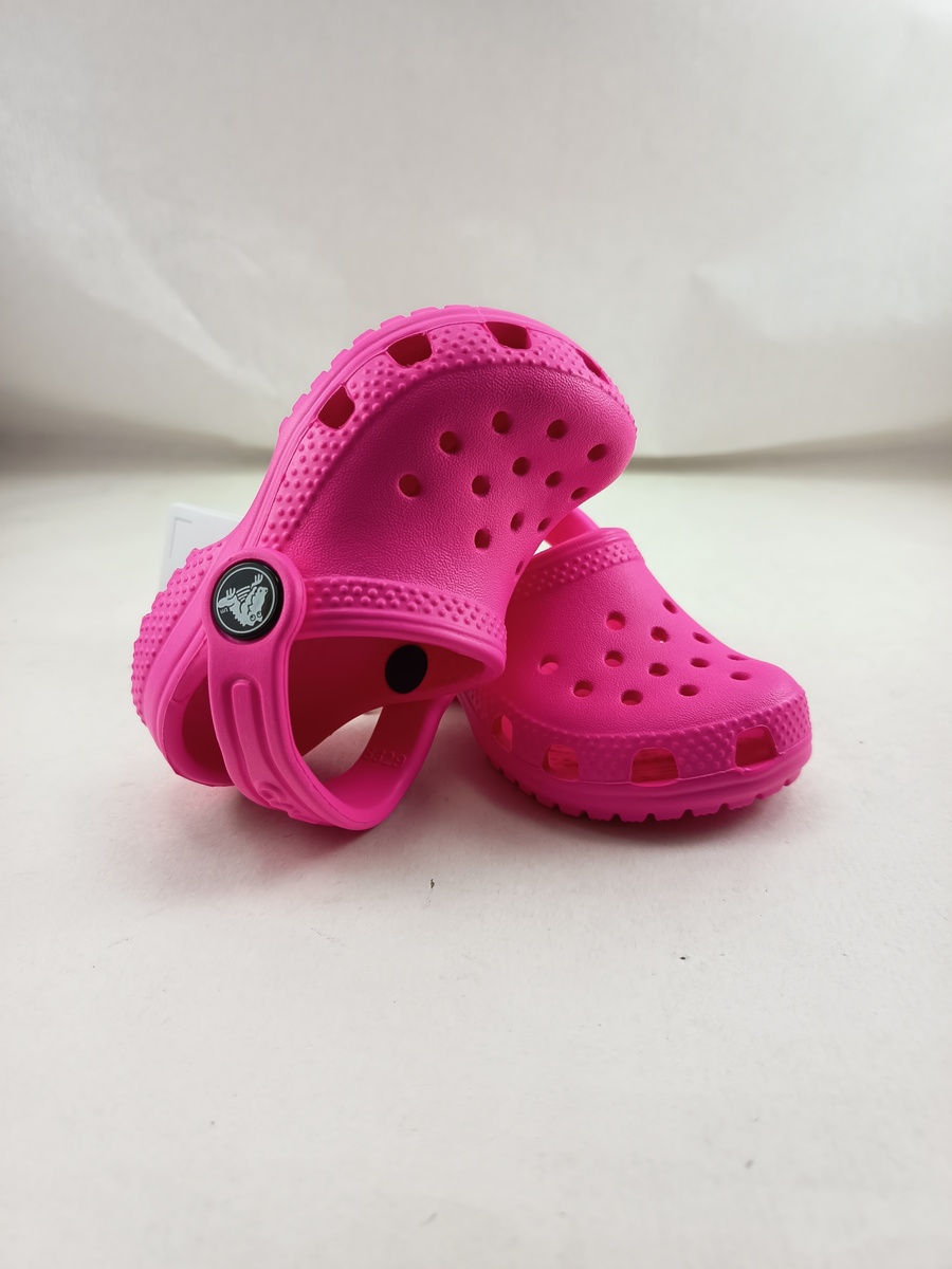 Croc classico rosa sin cierres y suela de goma, con tira trasera.