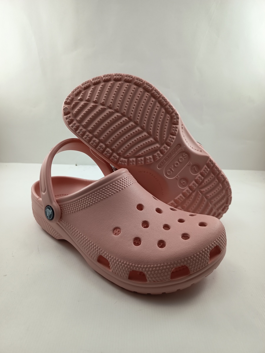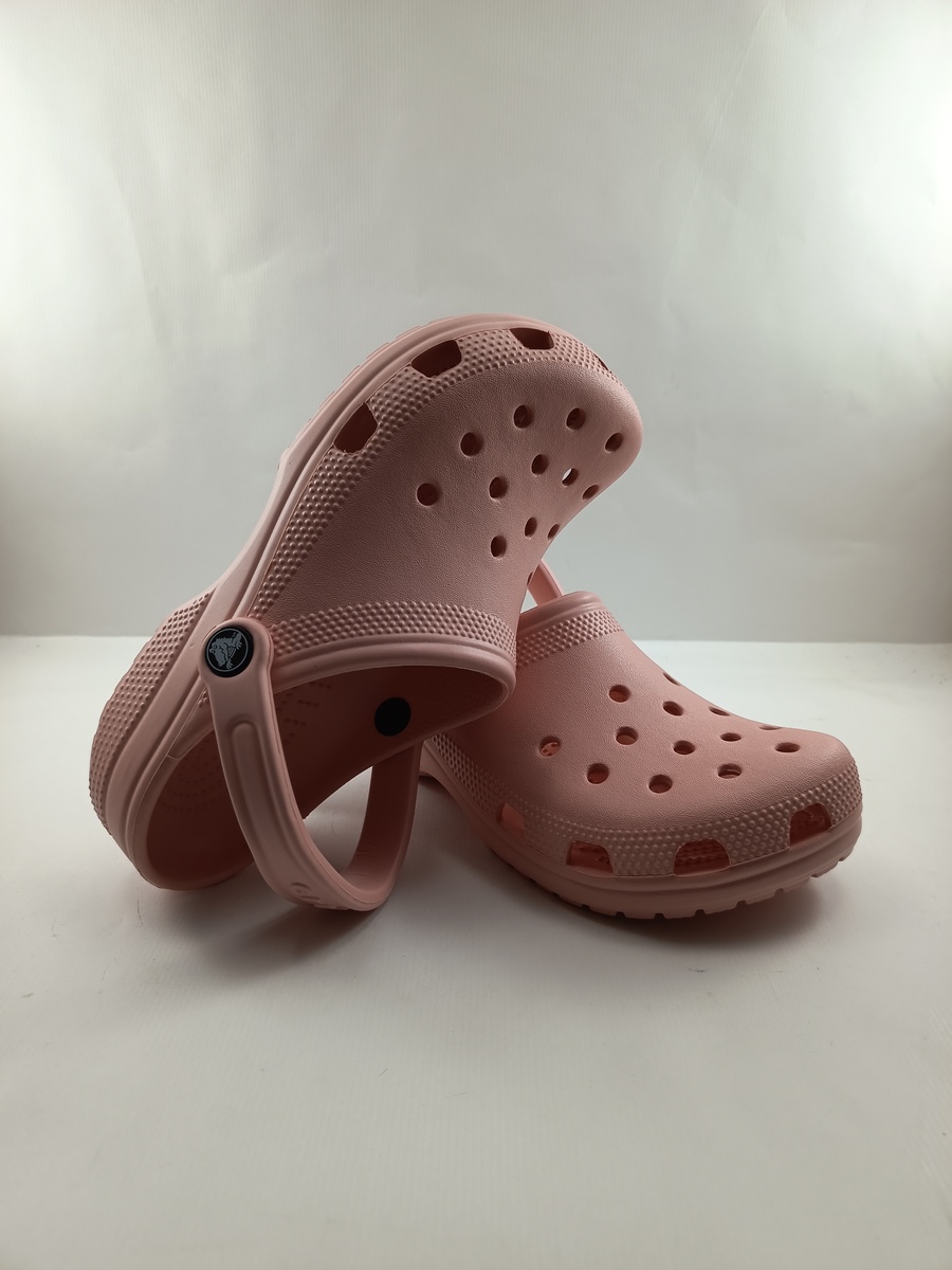 Croc classico rosa sin cierres y tira trasera, suela de goma.