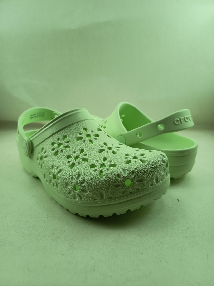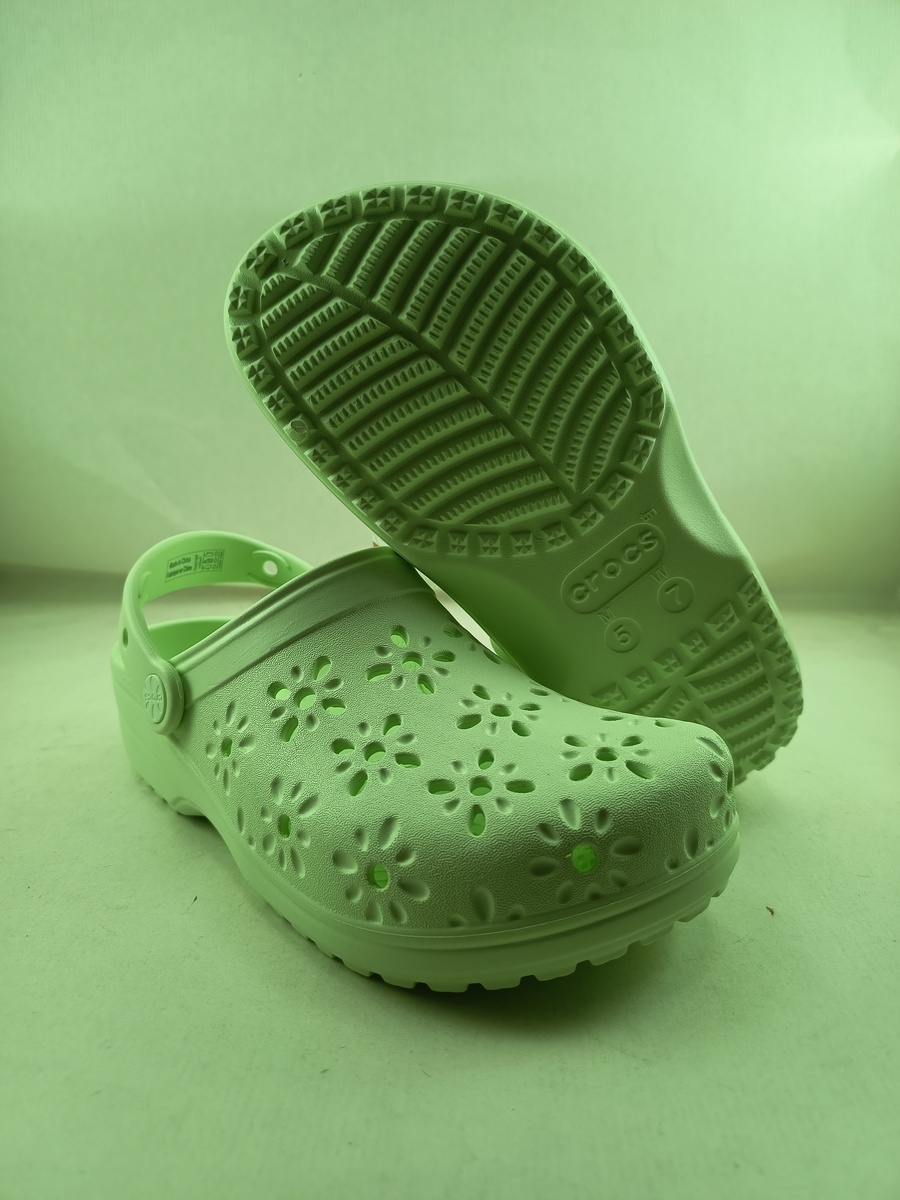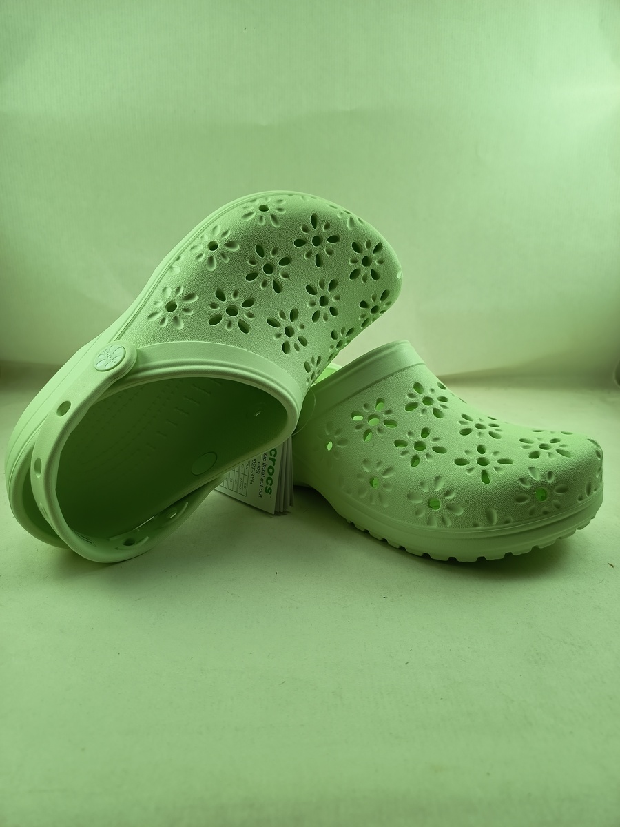 Crocs floral verde sin cierres y suela de goma, con tira trasera i detalle de flores caladas en todo ello.