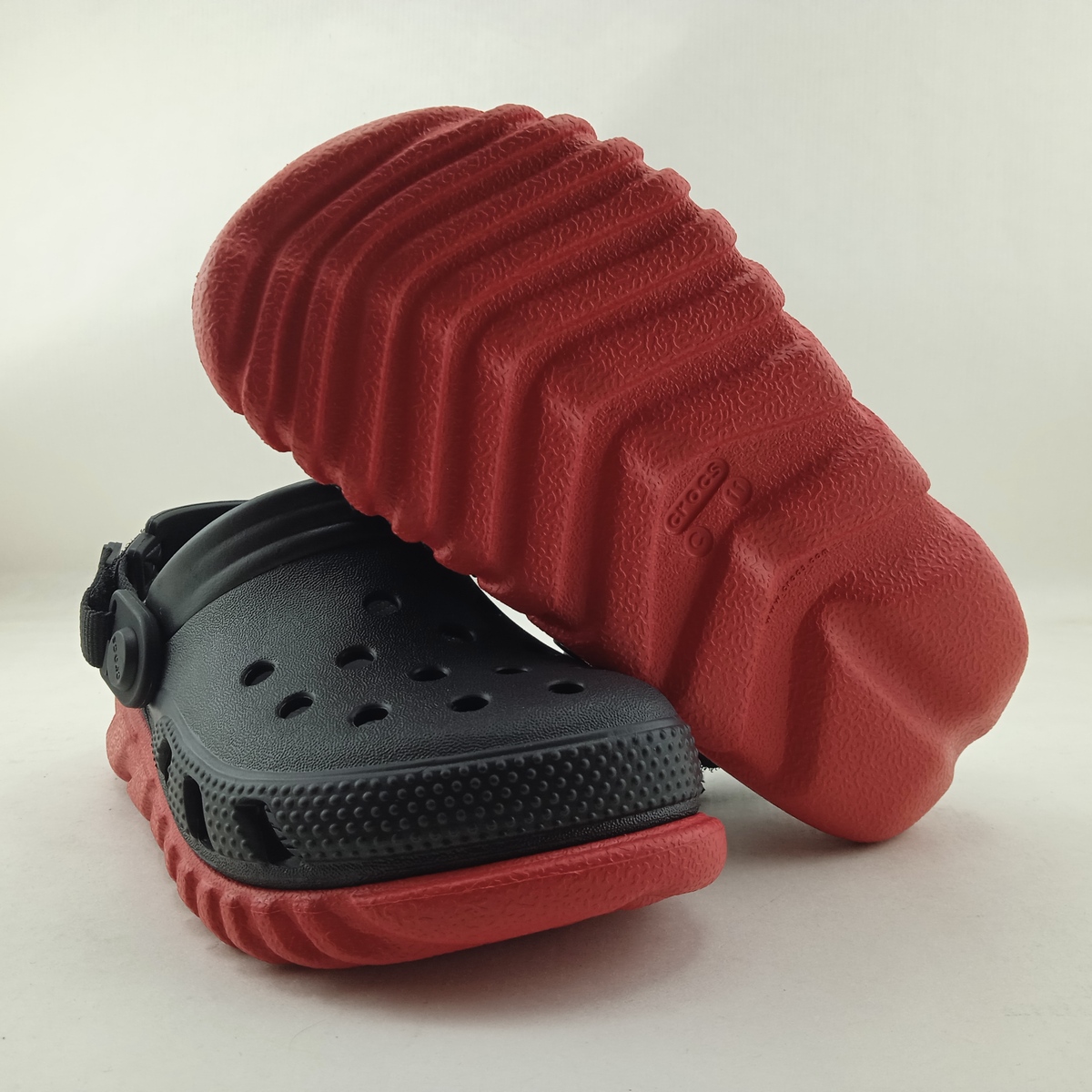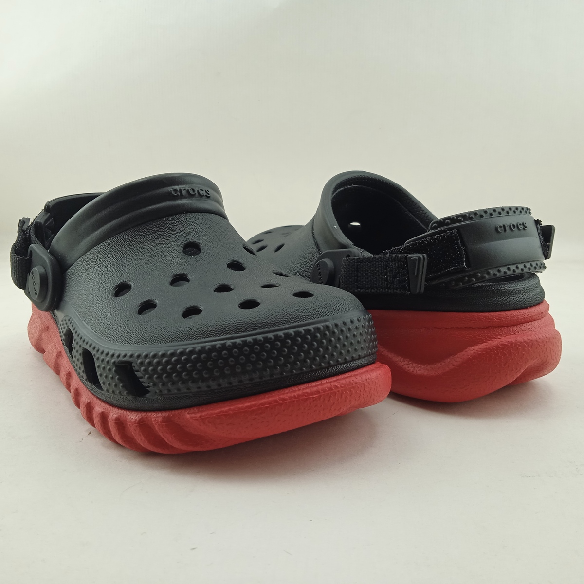 Croc sintetico negro con suela roja sin cierres y suela de goma, con tira en tacon para mejor sujecion.