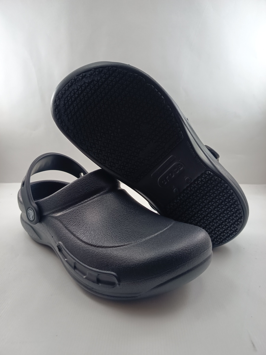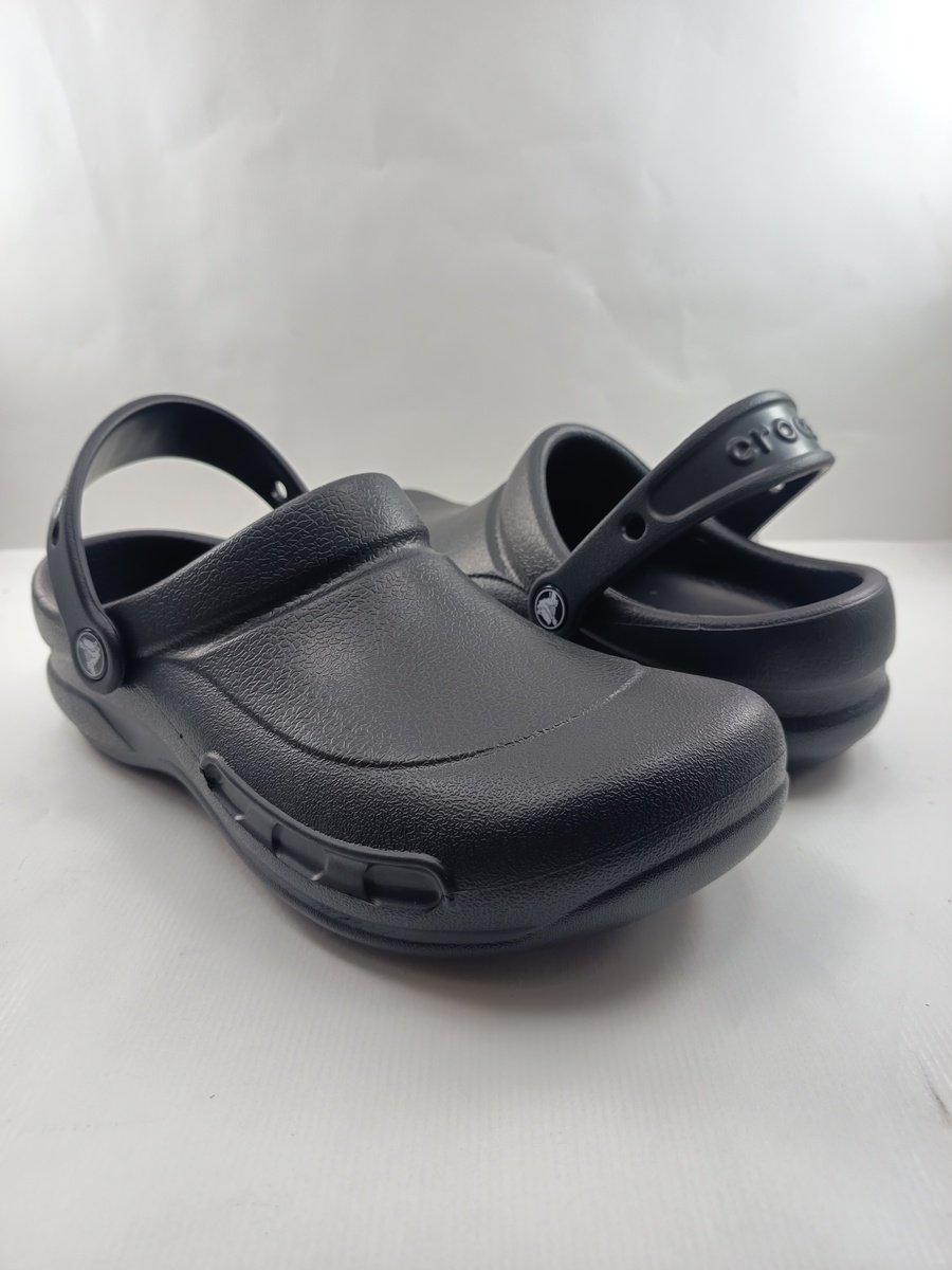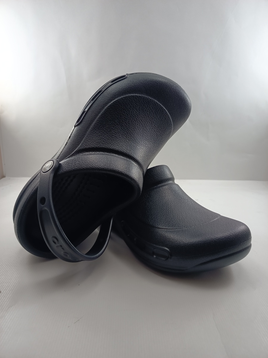 Croc sinetico negro sin cierres y tira trasera, suela de goma, este modelo no lleva agujeros delanteros.