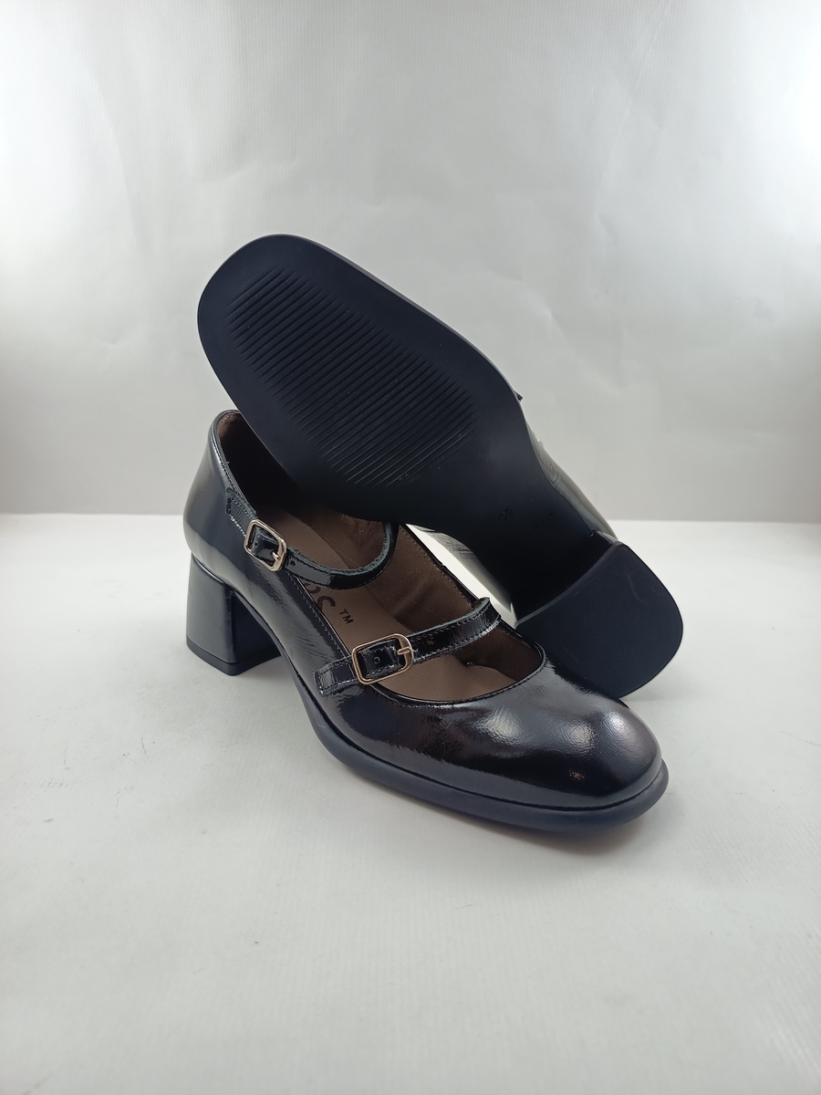 Mercedes de charol negro con cierre de hebillas y suela de goma, forro y plantilla de piel.