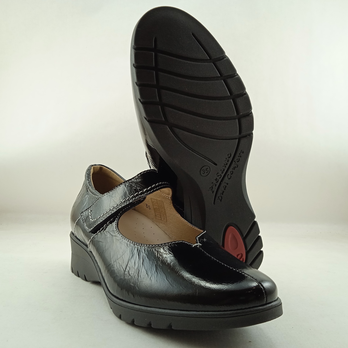 Mercedes de piel negra con cierre de velcro en empeine y suela de goma, forro y plantilla de piel.