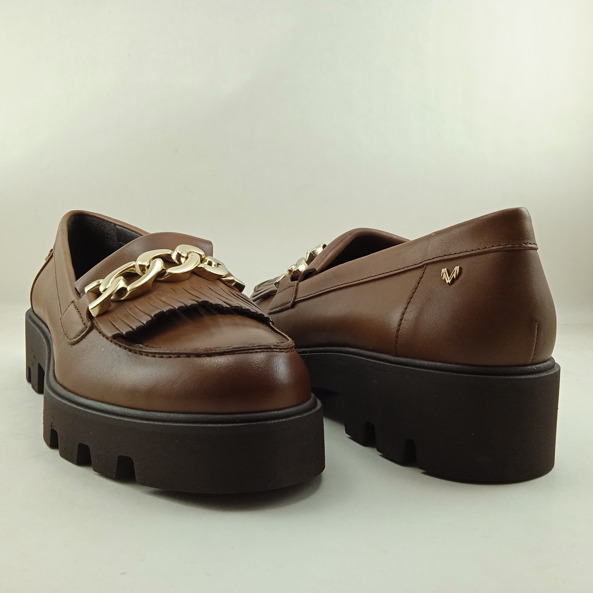 Mocasin de piel en cuero sin cierre y suela de goma, con detalle de cadena en empeine, forro y plantilla de piel.