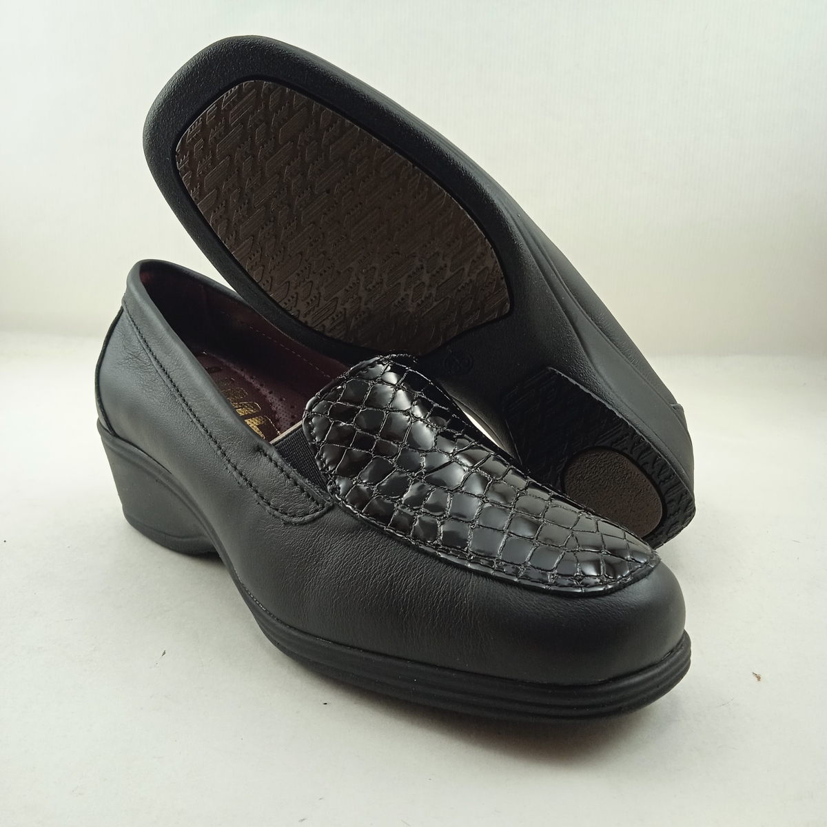 Mocasin de piel negra sin cierres y suela de goma con cuña de 2cm, forro y plantilla de piel, detalle gravado en empeine.