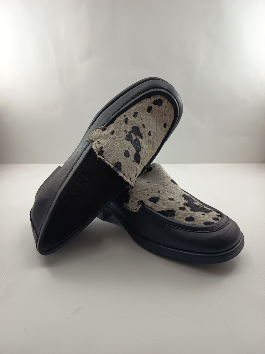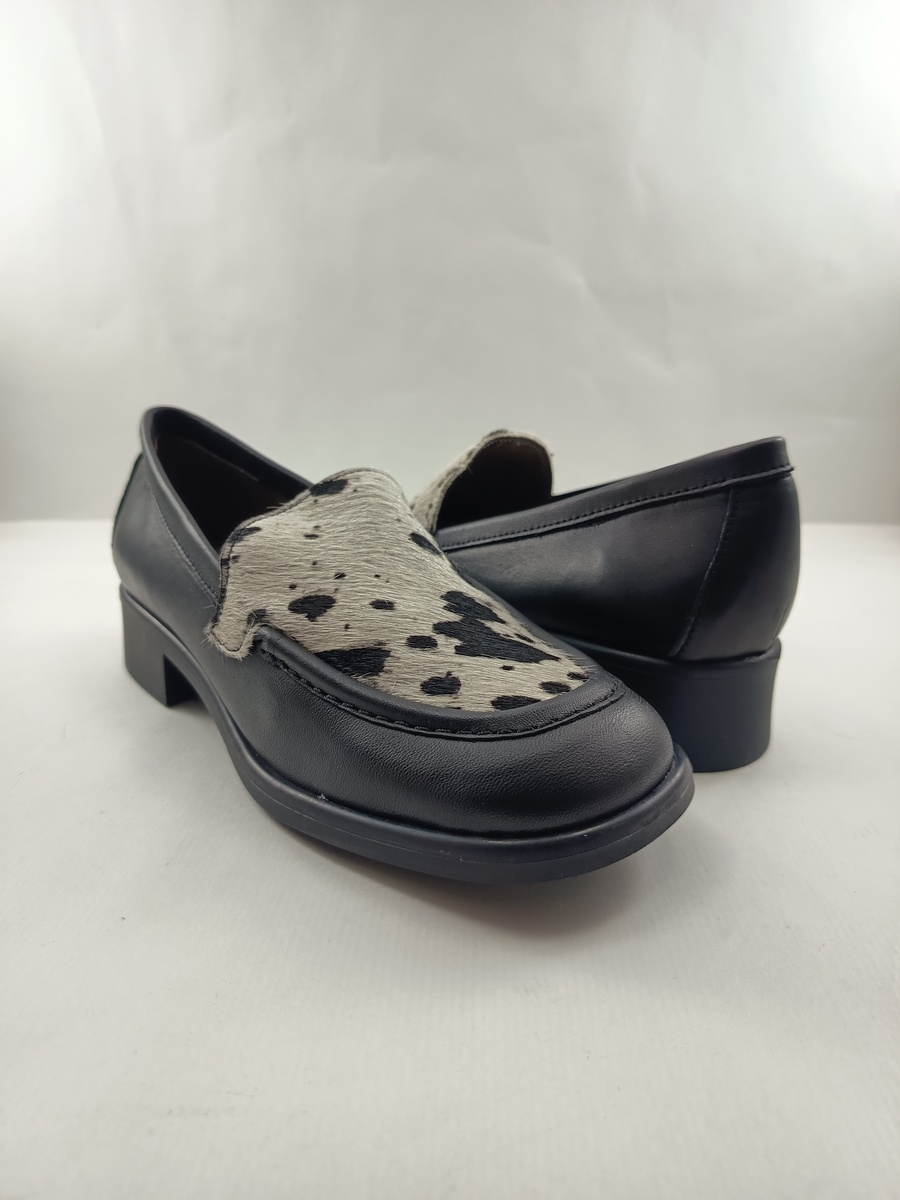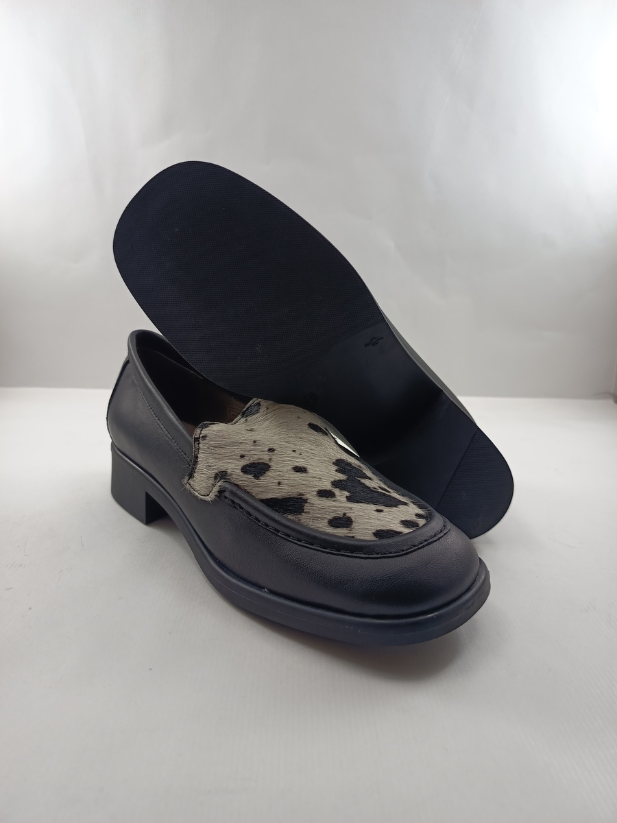 Mocasin de piel negro sin cierres y suela de goma, forro y plantilla de piel, detalle de animal print en empeine.