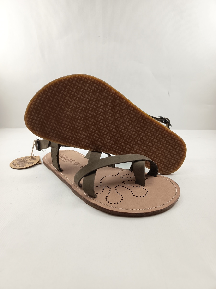 Sandalia barefoot de piel verde con cierre de hebilla y suela de goma, forro y plantilla de piel, detalle de tiras cruzadas en empeine y dedo.