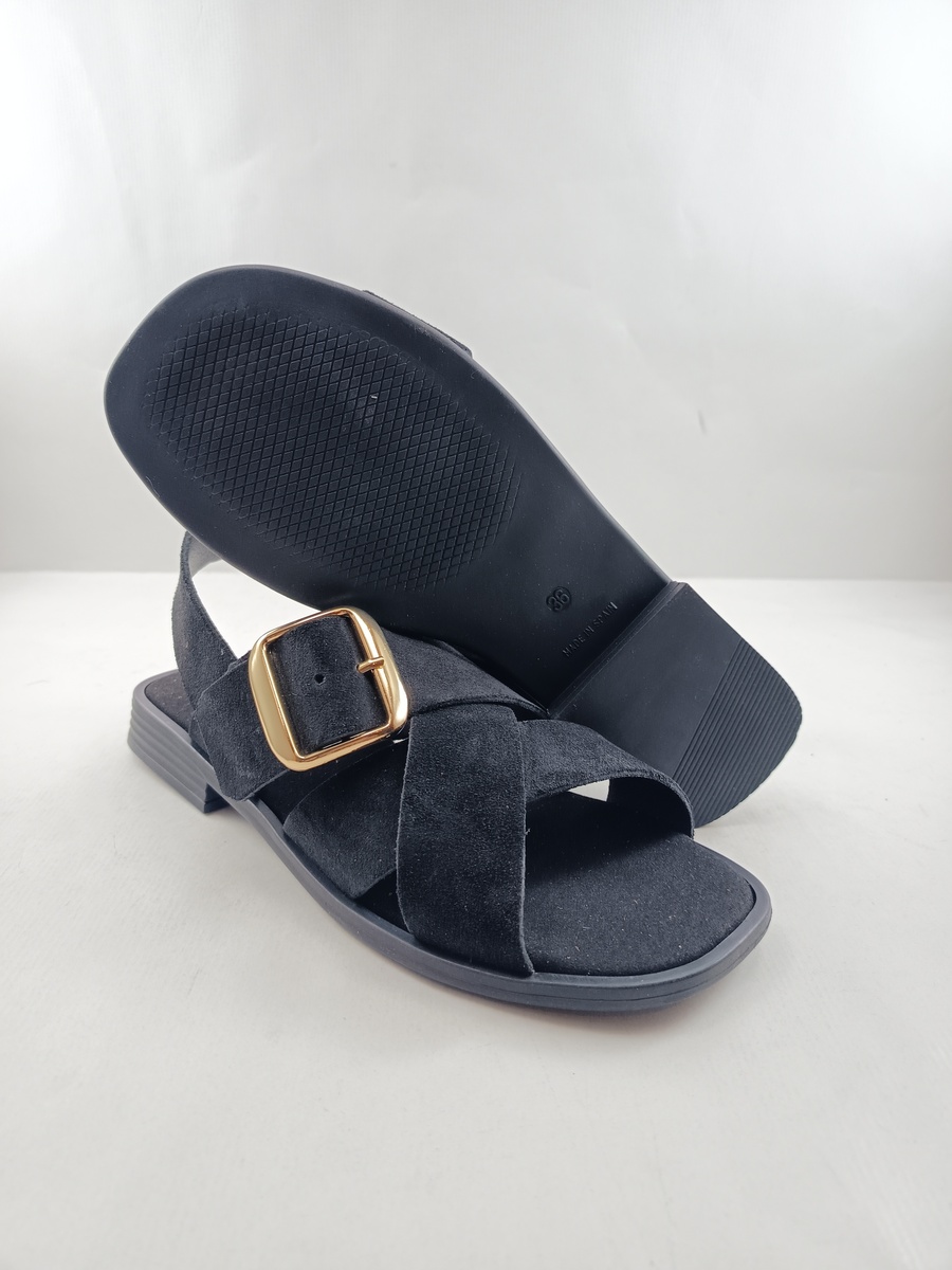 Sandalia de ante negro con cierre de hebilla y suela de goma, forro y plantilla de piel, detalle de tiras cruzadas en empeine.