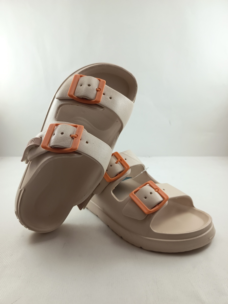 Sandalia de goma crema con cierre de doble hebilla y suela de goma, detalle de hebillas en naranja.
