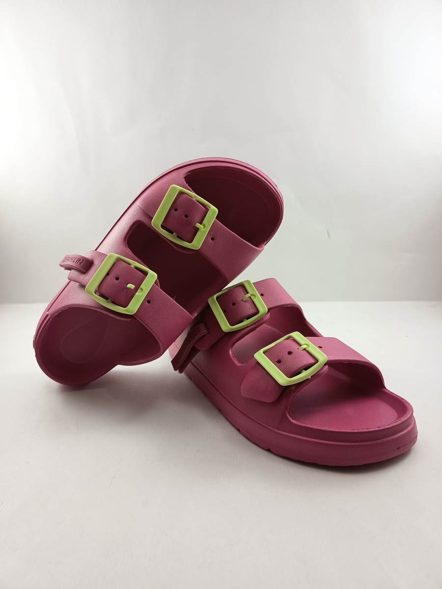 Sandalia de goma rosa con cierre de doble hebilla y suela de goma, detalle de hebillas en amarillo.