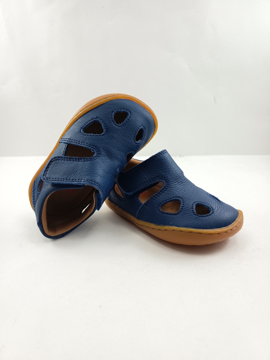 Sandalia de cortes en piel azul con cierre de velcro, suela de goma, forro y plantilla de piel, detalle de pespunte visto en vira.