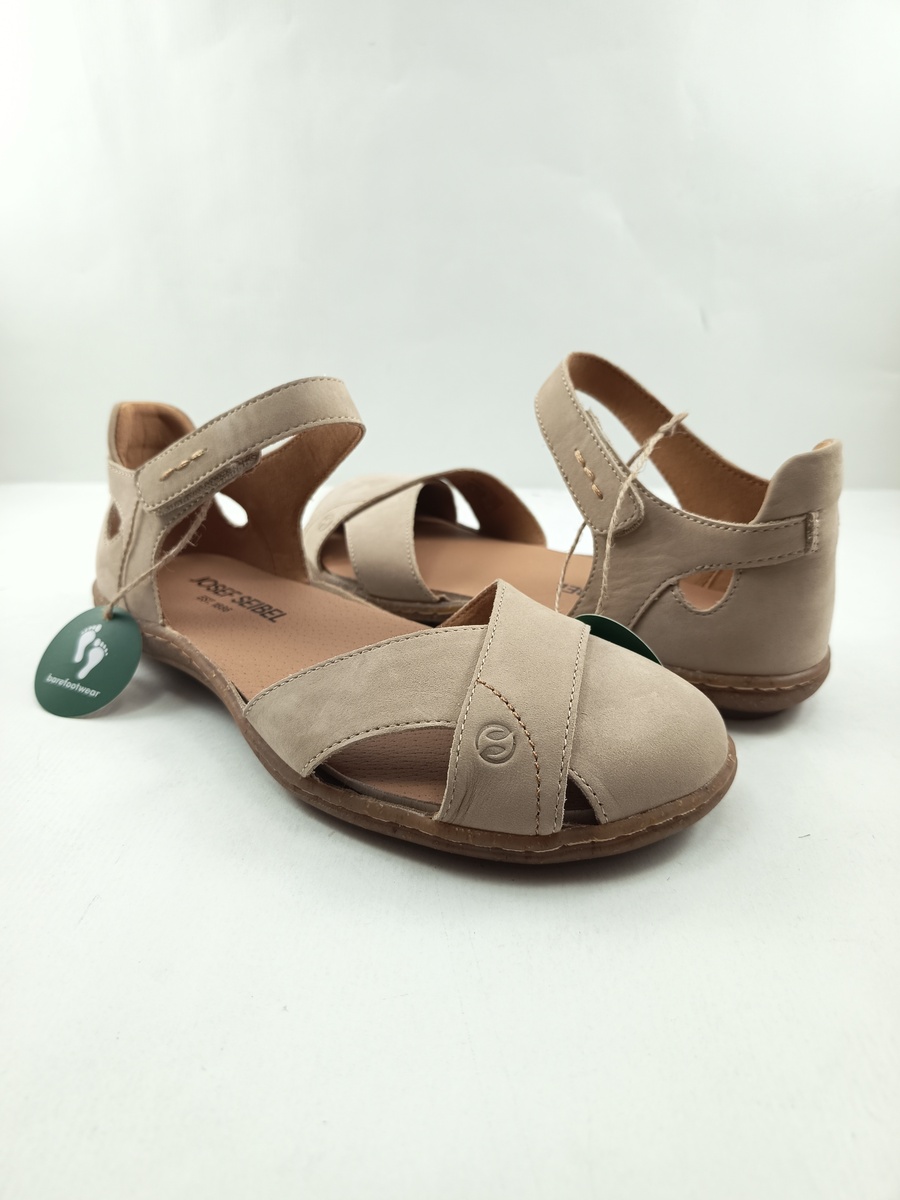 Sandalia de piel crema con cierre de velcro y suela de goma, forro de piel y plantilla de caucho, detalle de punta cerrada y tira delantera cruzada, comoda y ligera.