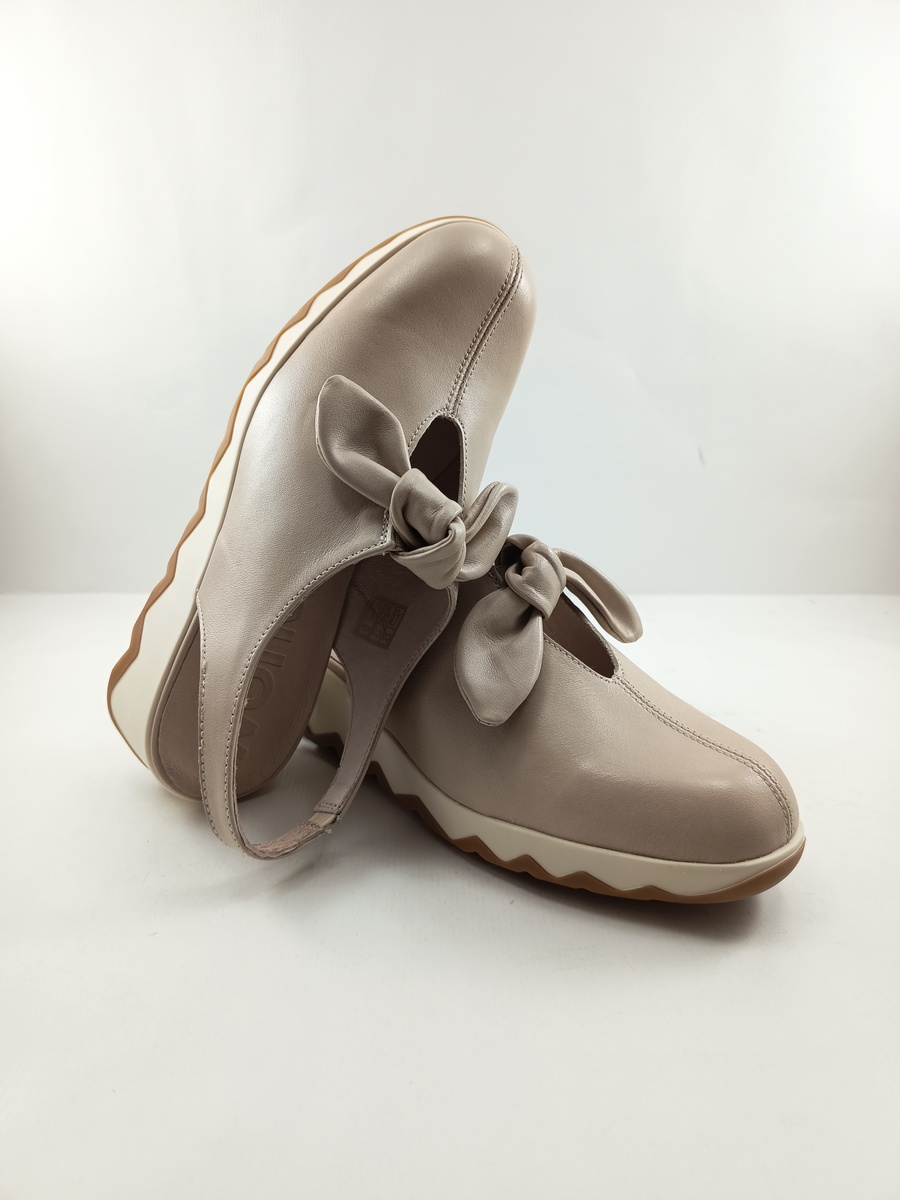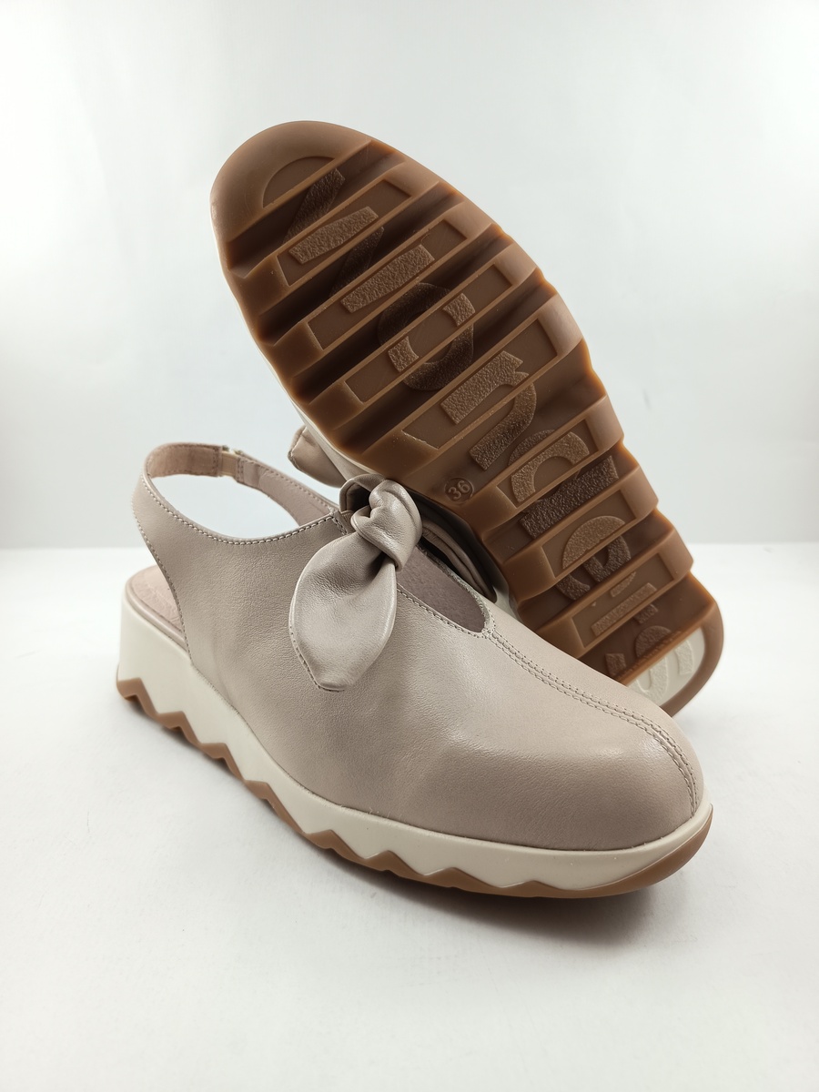 Sandalia de piel crema sin cierres y goma elastica, forro y plantilla textil y piel, detalle de lazo en empeine.