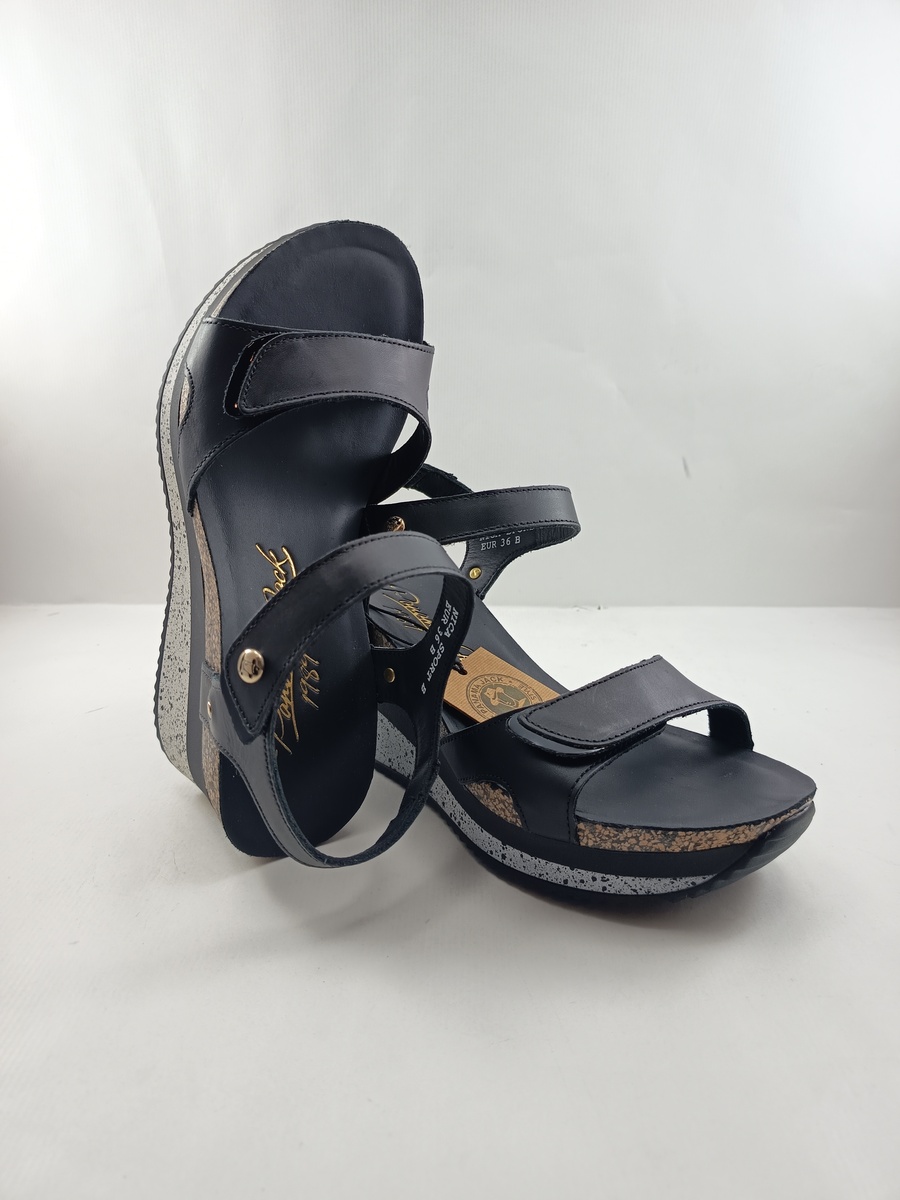 Sandalia de piel negra con cierre de velcro en tiras y suela de goma en blanco, forro y plantilla de piel, cuña de 4.
