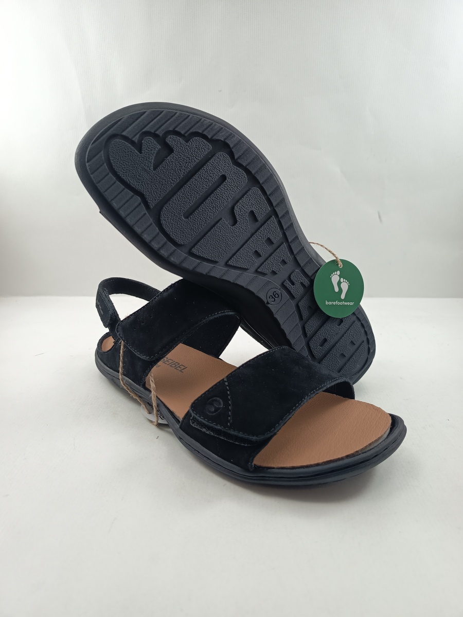 Sandalia de piel negra con cierre de velcros y suela de goma, forro de piel y plantilla de caucho, ajuste maximo al tener todas las tiras ajustables, comoda y ligera.